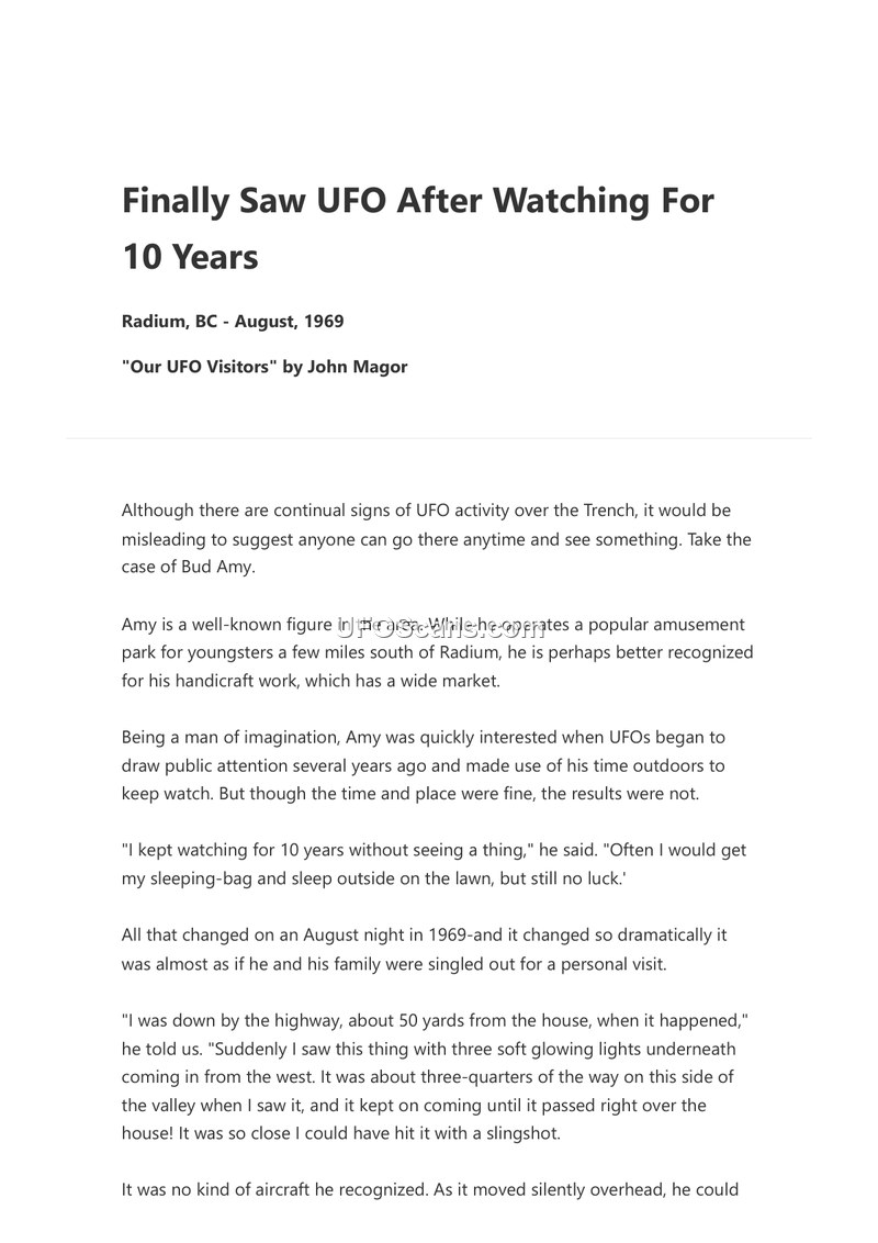 This document details a UFO sighting reported by Bud Amy, a resident of the Radium, British Columbia area, in August 1969. Amy, who had been watching the skies for ten years, observed a circular object with three soft glowing lights in a triangular formation approaching from the west. He estimated the object to be approximately 50 feet in diameter. The object passed silently over his house, at which point he called his wife, Elizabeth, and son, Arnold, to witness the craft. The object proceeded toward the eastern ridge of mountains, during which time the lights changed configuration. Amy contacted a skeptical friend in Windermere to observe the object. The friend initially observed the light as stationary, but later witnessed it move at a high speed, traveling northward and then crossing the valley to the south. The account concludes by noting that the friend was convinced of the reality of the phenomenon after his own observation.
