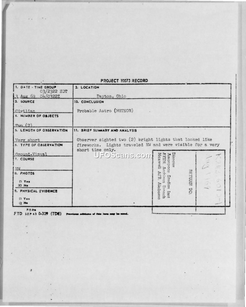 Project 10073 Records: UFO Sightings in Dayton, Ohio (August 1969)