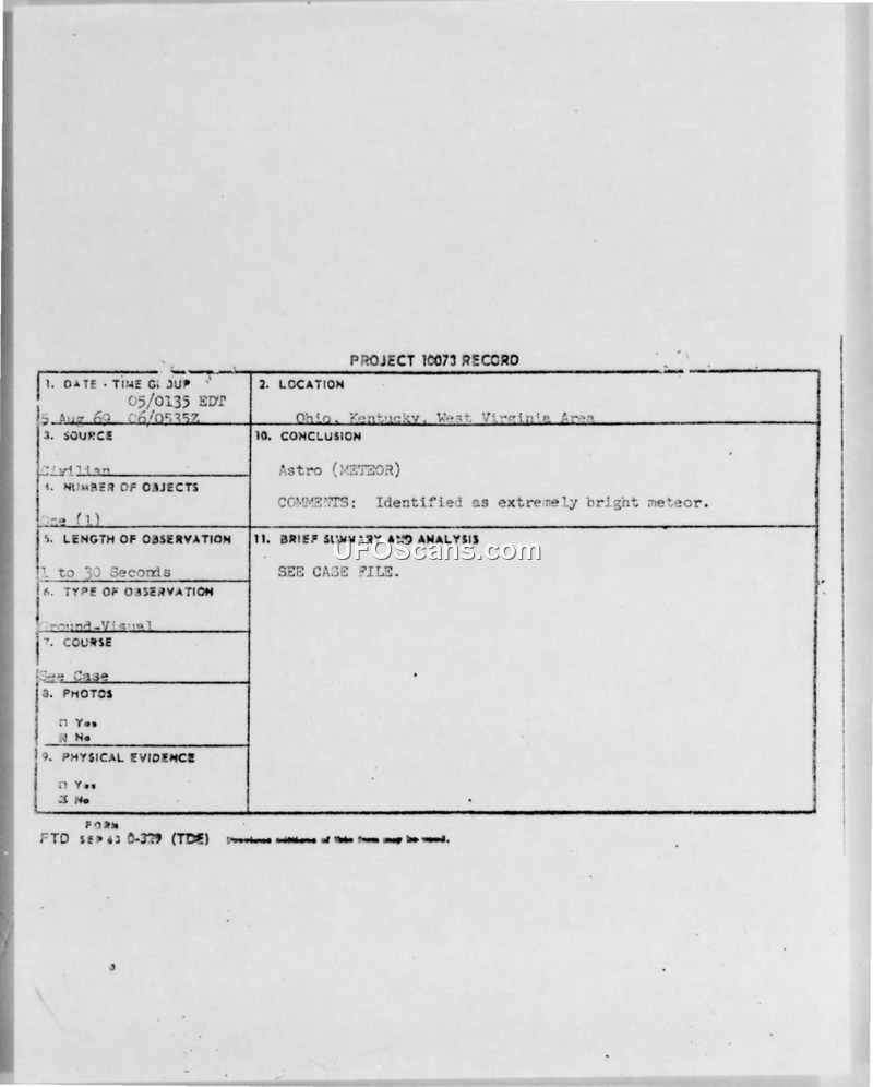 A widespread fireball sighting occurred on August 5, 1969, across the Ohio Valley. The Air Force's Foreign Technology Division investigated the event, concluding it was a bright meteor.