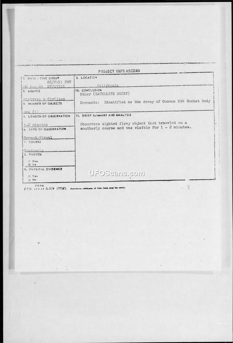 A 1969 UFO sighting in California was reported by a USAF pilot. The Air Force officially identified the object as the decaying body of the Cosmos 294 rocket.