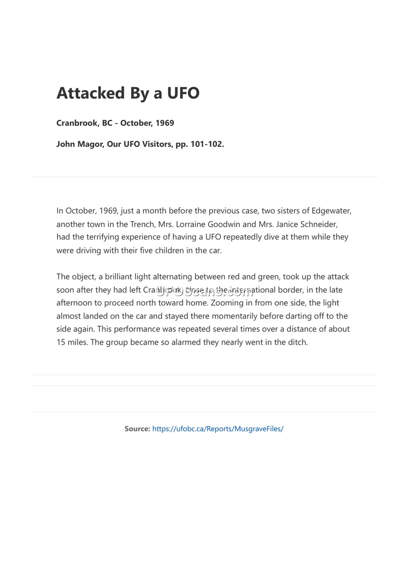 This document recounts a 1969 UFO sighting near Cranbrook, BC, where two women and five children were pursued by a light-emitting object for 15 miles. It serves as a historical record of the event as documented in John Magor's 'Our UFO Visitors'.