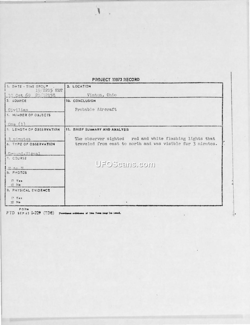 A civilian in Vinton, Ohio, reported a 3-minute sighting of an object with red and white flashing lights on October 19, 1969. The Air Force concluded the object was a 'probable aircraft' based on the witness's description.