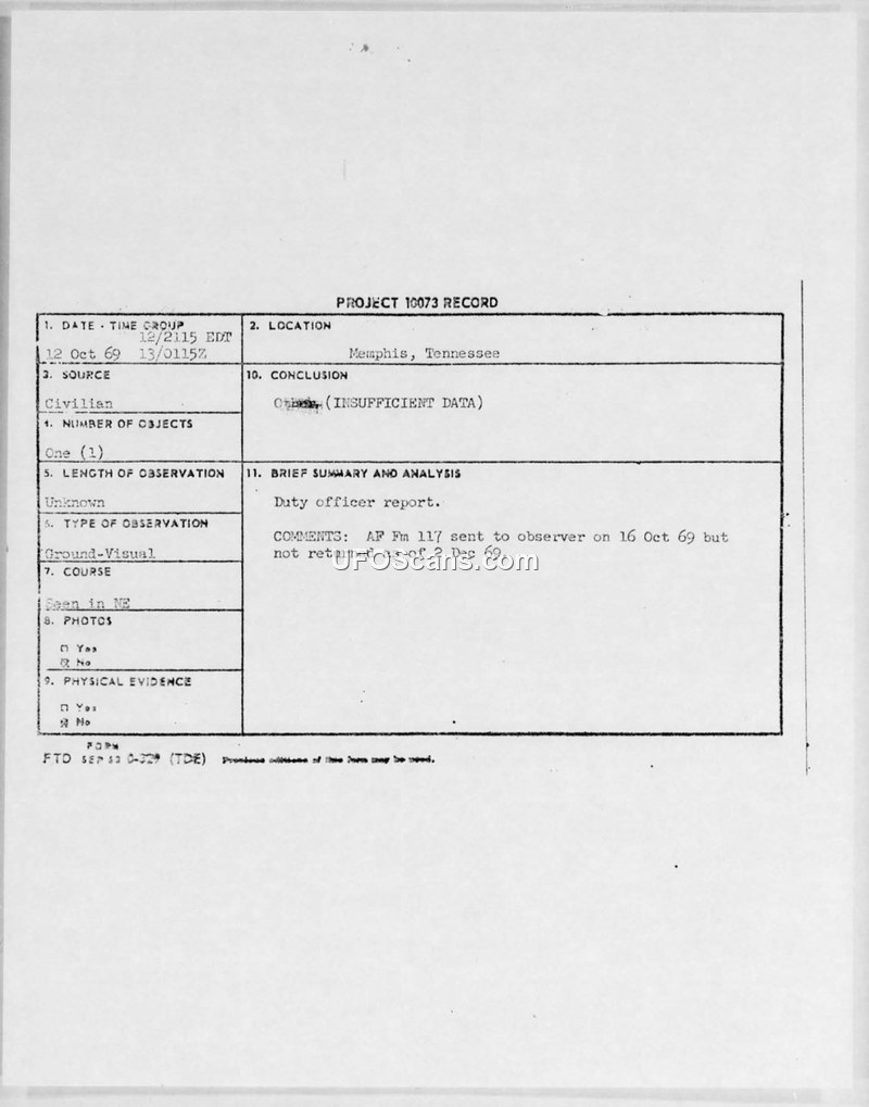 A civilian reported a UFO sighting in Memphis, Tennessee, on October 12, 1969. The Air Force closed the case as 'insufficient data' after the observer failed to return a follow-up questionnaire.