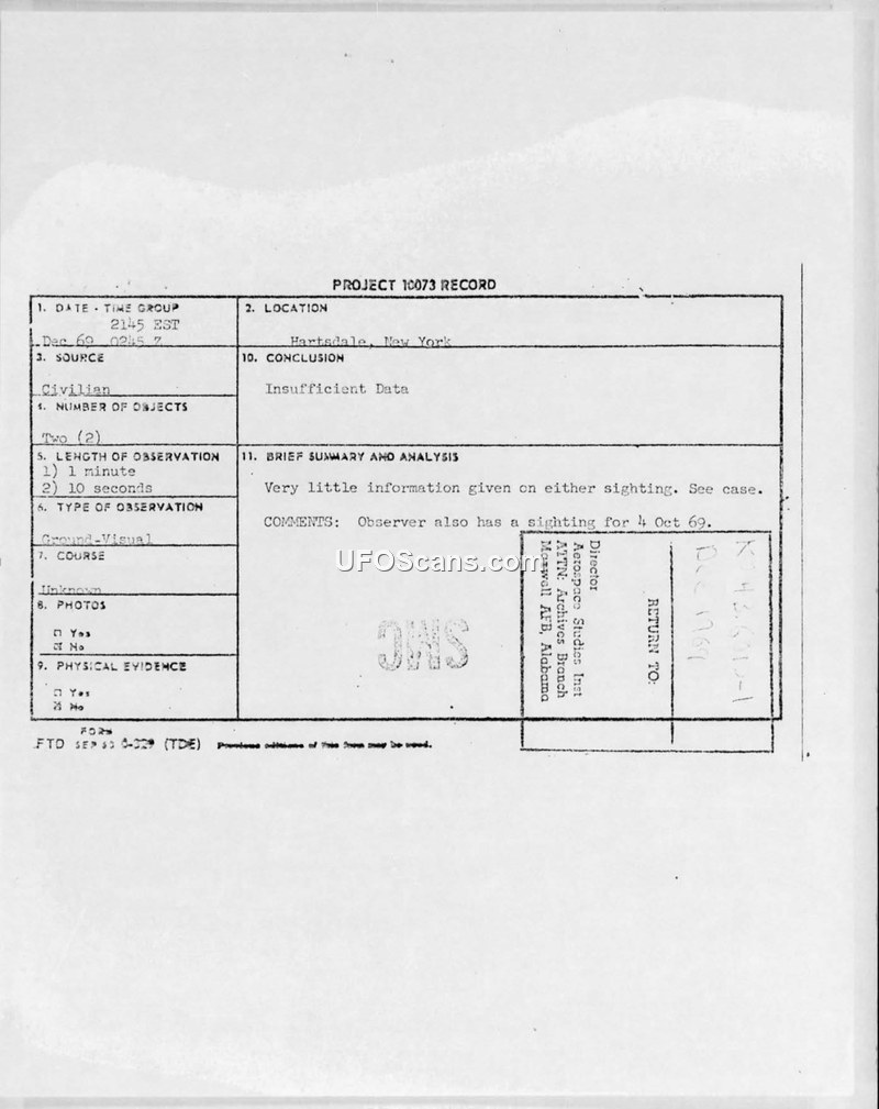 A civilian report of two UFO sightings in Hartsdale, New York, in December 1969. The Air Force classified the case as 'Insufficient Data'.