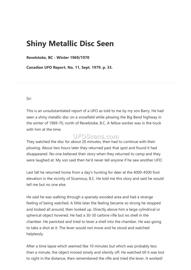This document, published in the Canadian UFO Report (No. 11, September 1979), details two separate, unsubstantiated UFO sightings reported by a man named Barry to his father, Arthur N. Zettergreen. The first incident occurred during the winter of 1969-1970 on the Big Bend highway north of Revelstoke, British Columbia. Barry and a fellow worker observed a shiny metallic disc resting on a snowfield for approximately 20 minutes while they were plowing the highway. Upon returning to the location two hours later, the object was gone. The witnesses were reportedly ridiculed by their peers at camp, leading Barry to keep future sightings to himself. The second incident took place in the fall of 1978 while Barry was hunting for deer at an elevation of 4000-4500 feet near Sicamous, British Columbia. While walking through a wooded area, he experienced a sensation of being watched. Upon looking up, he observed a large, bright, silvery object that was either cylindrical or spherical in shape, hovering several hundred feet above him. Barry, who was carrying a 30-30 carbine rifle, attempted to chamber a shell to fire at the object, but found that the rifle's lever would not move. He stood helplessly as the object hovered for a duration he estimated as ten minutes, though he noted it was likely less than a minute. The object then moved away slowly and silently. Once the object was out of sight, the rifle's lever functioned normally again. Arthur N. Zettergreen describes his son as a matter-of-fact individual not prone to fantasy or deceit.