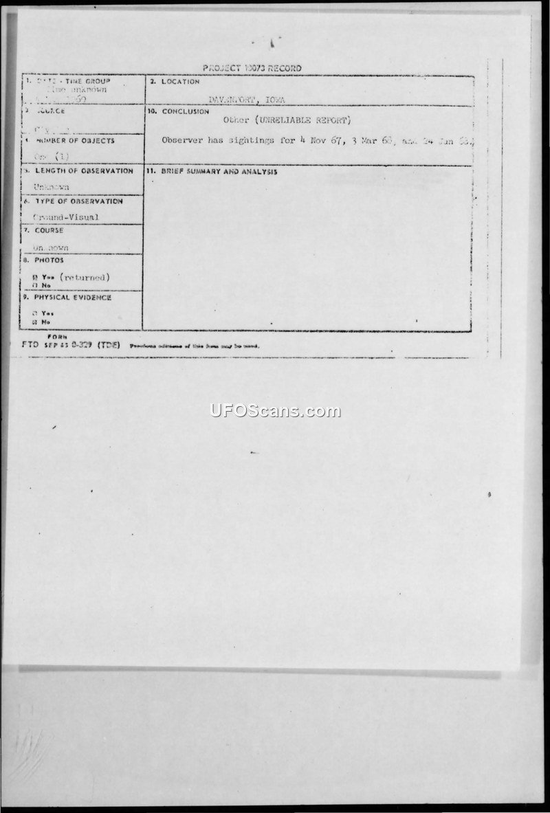 This document collection contains records related to a series of UFO sightings reported by an individual in Davenport, Iowa. The primary record, a Project 10073 form, notes sightings occurring on November 4, 1967, March 3, 1968, and June 24, 1968. The official conclusion for these reports was 'Other (UNRELIABLE REPORT).' A letter dated May 20, 1969, from Lt. Colonel Hector Quintanilla, Jr. of the Aerospace Technologies Division, confirms the return of photographic negatives to the observer, referencing a previous letter from May 12, 1969. The collection also includes a newsletter from the Tri-State UFO Study Group, which discusses the 'Gordon Koehnke Story' and mentions that the group intended to evaluate the authenticity of photographs and interview tapes related to these sightings. The newsletter highlights the involvement of various individuals, including clinical psychologist Sandra J. Eber and Dr. Allen Utke, an assistant professor of chemistry, in analyzing the case. Sketches included in the document depict a disk-shaped object with a black spot on top, described as metallic in appearance, observed under cloudy weather conditions.