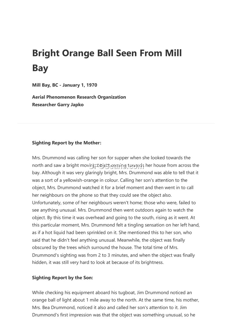 On January 1, 1970, in Mill Bay, British Columbia, a mother and son observed an unidentified aerial phenomenon. Mrs. Drummond first spotted a bright, yellowish-orange object moving from the north toward her home. She attempted to alert neighbors, but those who were home did not see the object. As the object moved overhead, she reported a tingling sensation on her left hand, which she described as feeling like hot liquid being sprinkled on her. Her son, Jim Drummond, who was aboard a tugboat, also observed the object. He initially intended to photograph it with a Polaroid camera but decided against it, believing the resulting image would only show a spot of light. As the object approached, it became stationary and increased in size to that of an orange. Using a telescope, Jim Drummond observed the object's structure, describing it as two cups placed lip-to-lip with a steep black outline. He noted nine dome-shaped, whitish-blue lights arranged around the middle. A beam of light, composed of a series of dashes, briefly projected from the object toward the ground. The object eventually departed rapidly toward the south, disappearing into clouds estimated to be 800 to 900 feet high. The total duration of the sighting was approximately 15 minutes, and the object was estimated to be 35 to 50 feet in diameter at an altitude of 300 feet.
