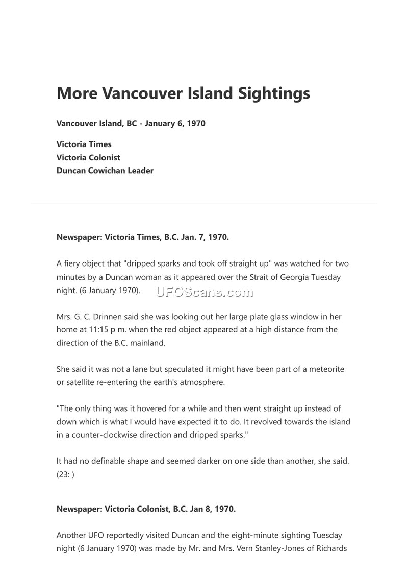 This document is a compilation of newspaper reports from the Victoria Times, Victoria Colonist, and Duncan Cowichan Leader, detailing a series of Unidentified Aerial Phenomena (UAP) sightings that occurred on Vancouver Island, British Columbia, on the night of January 6, 1970. The reports describe multiple witnesses observing bright yellow-orange objects over the Duncan, Maple Bay, and Crofton areas. Mrs. G. C. Drinnen, a Duncan resident, reported a fiery object that dripped sparks and moved straight up after hovering over the Strait of Georgia. Mr. and Mrs. Vern Stanley-Jones, who were leaving their business in downtown Duncan, observed a bright yellow-orange disc-shaped object at approximately 11:03 p.m. They noted that the object moved silently over Lakes Road hill, stopped, turned at a right angle, and eventually moved off rapidly to the west. Vern Stanley-Jones, identified as the president of the Cowichan-Chemainus UFO Club, suggested these sightings might mark the return of 'beepers.' Further reports from Mr. and Mrs. Arthur 'Buzz' LeQuesne and Mrs. Kay Clinchens corroborated the presence of a bright orange craft in the Maple Bay area. Mrs. LeQuesne, who expressed skepticism regarding UFOs, described the object as maneuvering in a counter-clockwise direction and ejecting fireballs. Mrs. Merrill, another witness, observed a light through binoculars and noted that it appeared to have a silver surface and moved in a way that she and her son concluded could not be a star. The reports consistently describe the objects as silent, bright, and capable of hovering and rapid, non-ballistic movement.