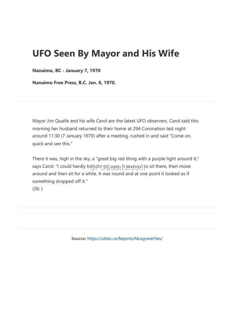 On January 7, 1970, Mayor Jim Quaife of Nanaimo, British Columbia, and his wife, Carol, observed an unidentified aerial phenomenon. According to the report published in the Nanaimo Free Press on January 8, 1970, the sighting occurred at approximately 11:30 PM at their residence located at 294 Coronation. Upon returning from a meeting, Mayor Quaife alerted his wife to the object in the sky. Carol Quaife described the object as a large, round, red entity surrounded by a purple light. She reported that the object remained stationary, moved around, and then returned to a stationary position. Additionally, she noted that at one point, it appeared as though something had dropped off the object.