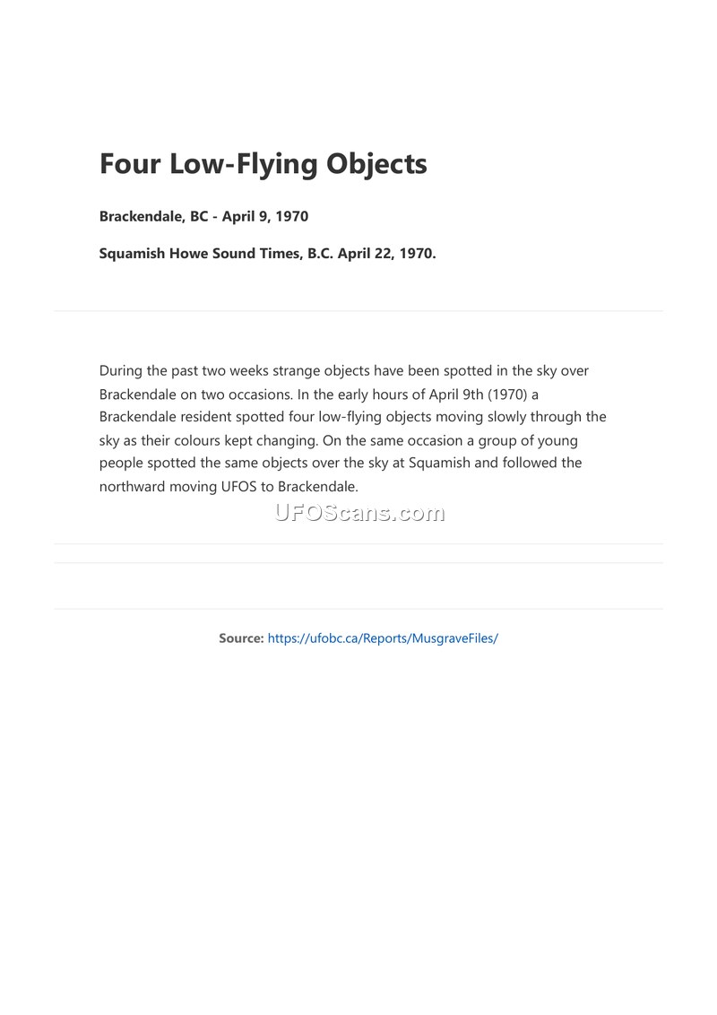 A 1970 newspaper report describes a sighting of four color-changing, low-flying objects over Brackendale and Squamish, British Columbia. The objects were observed moving slowly in a northward direction.