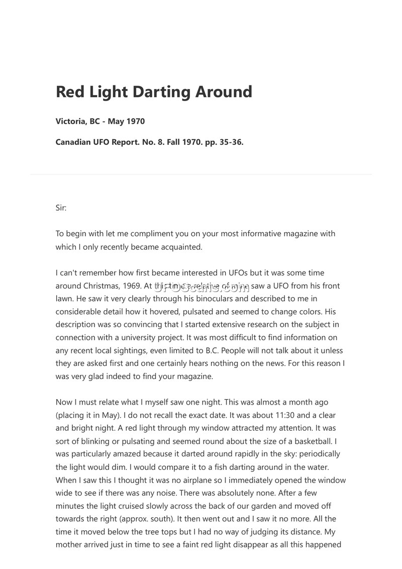 A letter to the editor of Canadian UFO Report detailing a May 1970 sighting of a red, pulsating light in Victoria, BC. The author also references a separate sighting by a friend and expresses interest in supporting the magazine's research efforts.