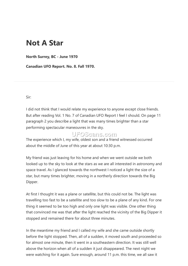 This document consists of a letter written by Peter Borkent of North Surrey, British Columbia, to the editors of the Canadian UFO Report, published in the Fall 1970 issue (No. 8). Borkent describes a sighting he experienced in mid-June 1970 alongside his wife, oldest son, and a friend. While observing the night sky, the group noticed a light that appeared to be the size of a star but significantly brighter. The object was initially moving in a northerly direction toward the Big Dipper. The witness notes that the object traveled too fast to be a satellite and too slow to be an aircraft. Upon reaching the vicinity of the Big Dipper, the object stopped and remained stationary for approximately three minutes. Subsequently, it moved south for about one minute before changing direction to the southeast and abruptly disappearing. The following night, the group observed the object again in the eastern sky, where it repeated similar maneuvers before disappearing. The editor of the Canadian UFO Report adds a note suggesting the object's flight path toward the Big Dipper might be deliberate, citing a previous report from issue No. 1 involving a witness named Marina McCreedy at Swift River, who observed a similar phenomenon in the same constellation.