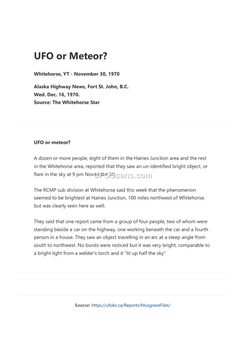 A bright object was observed by over a dozen people in the Haines Junction and Whitehorse areas on the evening of November 30, 1970. The RCMP reported that the phenomenon was most visible at Haines Junction.