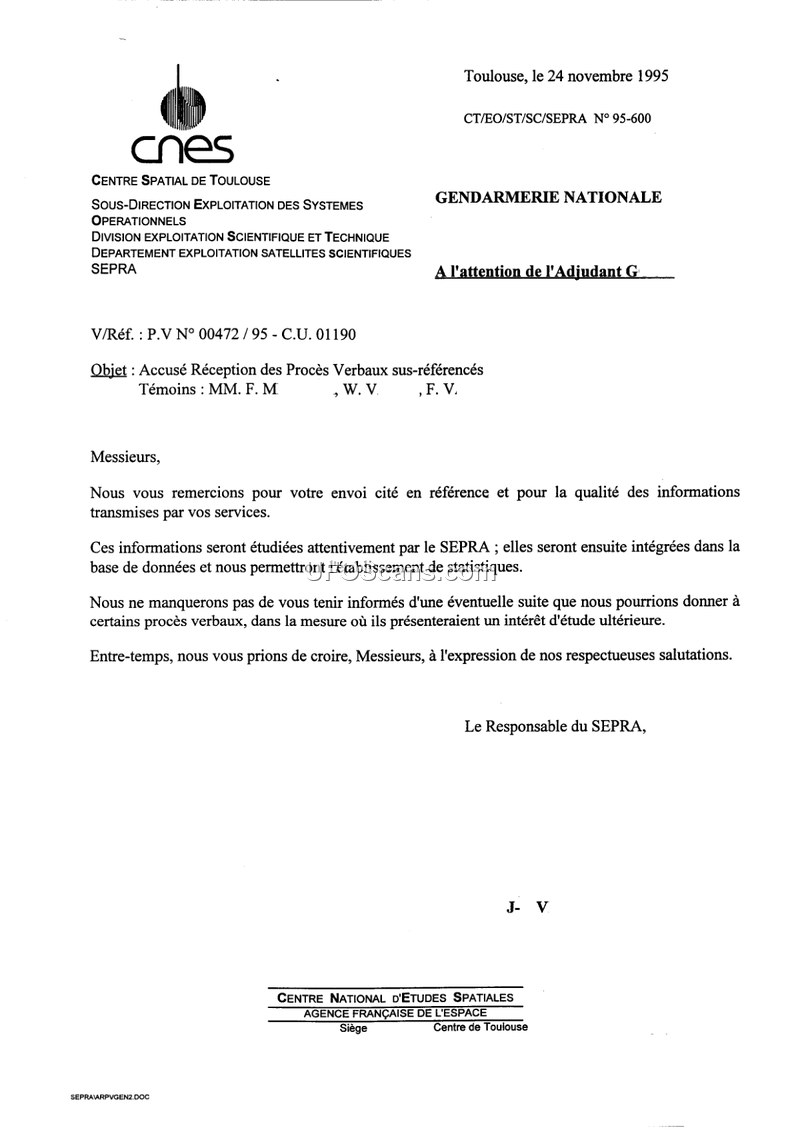 This document file contains correspondence and administrative reports regarding a UFO sighting that occurred on April 24, 1995, in France. The primary document is a letter from the SEPRA (Service d'Expertise des Phénomènes de Rentrée Atmosphérique) to the Gendarmerie Nationale, acknowledging receipt of the official reports (P.V. No 00472/95) concerning an observation made by three adolescents. The Gendarmerie reports detail that the three witnesses, aged 15 to 18, observed an ovoid, grey, cement-colored object approximately 20 meters in length. The object was seen hovering at an altitude of about 10 meters above a field for approximately 30 to 45 seconds before disappearing at high speed toward the horizon. The witnesses reported that the object had a red light on top and emitted no sound. The Gendarmerie conducted an on-site investigation, finding no physical traces on the ground. The reports also mention that a local newspaper published an article suggesting the phenomenon might have been a laser light test from a nearby nightclub, though the nightclub manager failed to appear for an interview with the Gendarmerie. The SEPRA confirmed that the data would be integrated into their database for future statistical study.