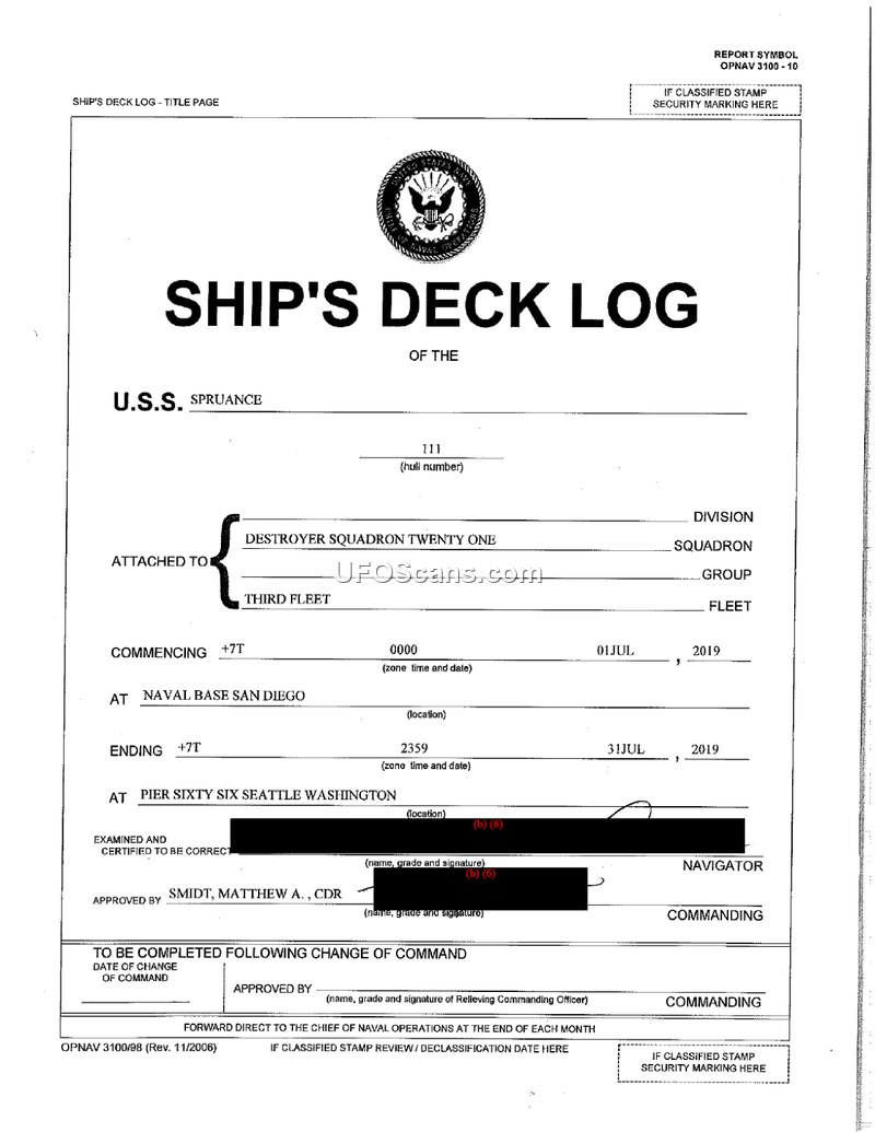 This document is the official July 2019 deck log for the U.S.S. Spruance, detailing routine naval operations, engineering status, and command transitions. It contains no information regarding UAP or UFO phenomena.