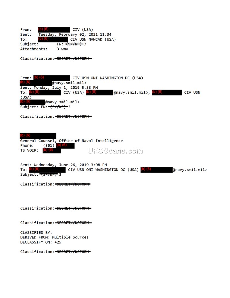 This document is an email chain consisting of internal communications within the Office of Naval Intelligence. The chain begins with an email sent on June 26, 2019, followed by a subsequent email on July 1, 2019, and concludes with a final email sent on February 2, 2021. The subject line for all emails in the chain is 'FW: (S//NF) 3'. The document includes an attachment titled '3.wmv'. The correspondence involves personnel from the Office of Naval Intelligence, including the General Counsel. The document is classified as SECRET//NOFORN and is marked for declassification 25 years after the date of origin.