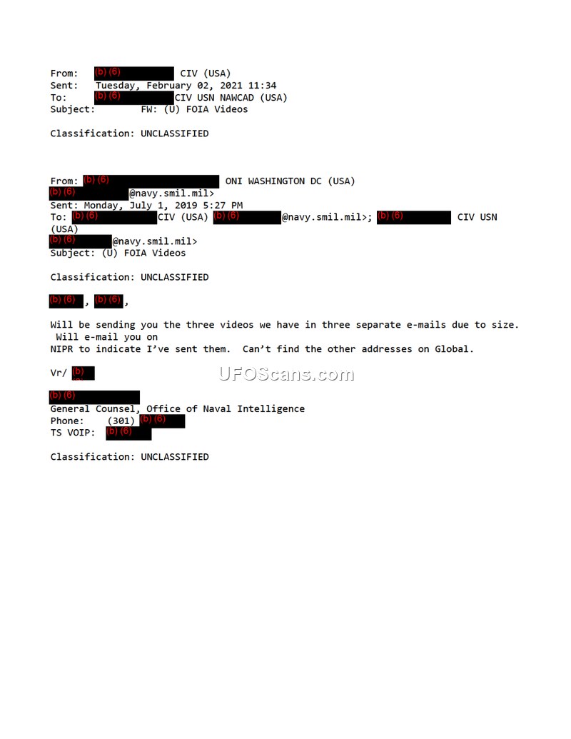 This document consists of an email thread regarding the transmission of three videos related to a Freedom of Information Act (FOIA) request. The correspondence originates from the Office of Naval Intelligence. An individual, identified as General Counsel for the Office of Naval Intelligence, informs recipients that they will be sending three videos in separate emails due to file size limitations. The sender notes that they will provide notification via NIPR once the files have been sent, citing difficulty in locating the recipients' addresses on the Global address system. The document is marked as UNCLASSIFIED.