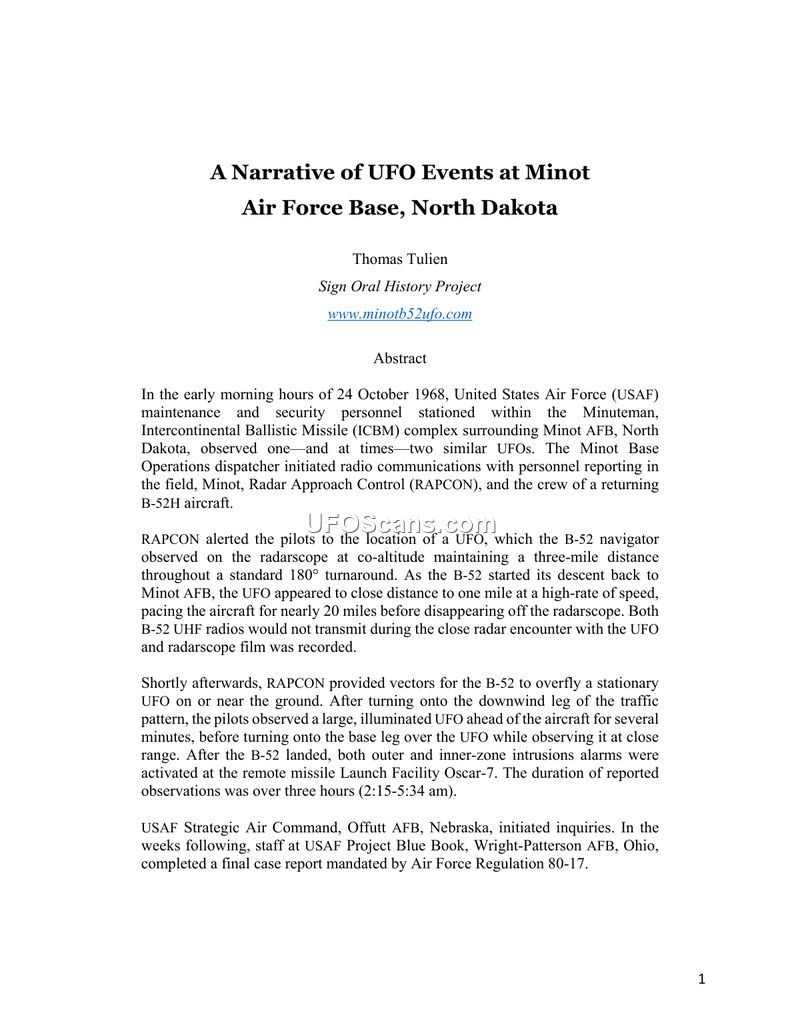 This document provides a detailed historical narrative of a series of Unidentified Aerial Phenomena (UAP) events that occurred at Minot Air Force Base, North Dakota, on the early morning of 24 October 1968. The events involved multiple military personnel, including security teams at Minuteman missile launch facilities and the crew of a returning B-52H Stratofortress. The narrative begins with reports from security teams at the Oscar-6 launch facility, who observed a large, glowing object near their post. Simultaneously, maintenance personnel driving to the November-7 launch facility reported a luminous object that appeared to pace their vehicle. These sightings were reported to the Base Operations dispatcher, who established an open line of communication between ground observers and the Radar Approach Control (RAPCON). As the events unfolded, a B-52H bomber returning from a training mission was diverted to investigate. The B-52 crew, specifically the navigator and radar navigator, detected a large, unidentified radar return that maintained a constant distance from the aircraft during a standard turnaround maneuver. The object later appeared to close distance to the aircraft instantaneously, at which point the B-52's UHF radios ceased transmission. The B-52 was subsequently vectored to overfly a stationary object on or near the ground. The crew observed a large, illuminated, egg-shaped object with a metallic tubular section and a crescent-shaped protuberance. Following the B-52's landing, security alarms were triggered at the remote missile Launch Facility Oscar-7, where security teams discovered an access hatch standing open, though no intruders were found. The document highlights the extensive primary documentation available, including radarscope photographs and oral history interviews conducted by the Sign Oral History Project. It emphasizes the historical context of the Cold War, the strategic importance of Minot AFB as a dual-wing base for bombers and ICBMs, and the subsequent investigation by Project Blue Book under Air Force Regulation 80-17. The narrative concludes by noting that despite the extensive documentation and independent corroboration from multiple witnesses, the events remain a subject of historical inquiry, with the official record often lacking the supplementary details provided by the oral history accounts.