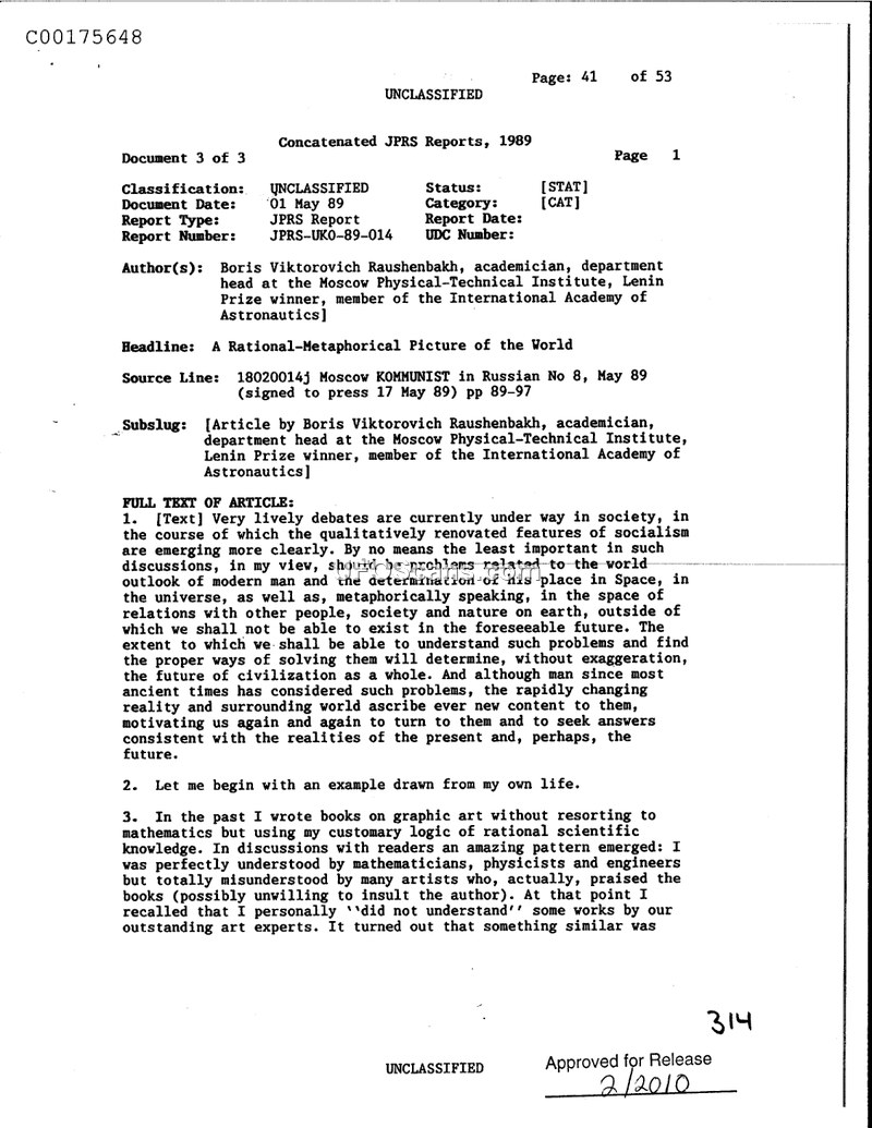 This JPRS report, authored by academician Boris Viktorovich Raushenbakh, explores the philosophical dichotomy between rational scientific thought and metaphorical, intuitive perception. Raushenbakh posits that the human brain possesses functional asymmetry, leading to two distinct ways of viewing the world: the 'physicist' (rational) and the 'lyricist' (metaphorical). He argues that while the modern age is dominated by scientific and technical progress, this focus has led to a decline in morality and a neglect of the 'irrational' components of human experience, which are essential for a holistic understanding of life. The author contends that scientific conclusions lack an inherent moral principle, and that morality is rooted in the metaphorical and intuitive aspects of human awareness. He cites historical examples, such as the works of writers like A. Tolstoy and Leonid Leonov, to demonstrate how intuitive, non-rational insights can sometimes anticipate scientific developments more accurately than strictly logical projections. Raushenbakh warns that the current trend of prioritizing rational, technical solutions to all problems—including those of social and ecological nature—is dangerous. He advocates for an 'integral world outlook' that combines scientific knowledge with emotional and moral depth, suggesting that this balance is vital for the survival and progress of society. The document also touches upon the role of religion and faith, framing them not as scientific errors, but as expressions of the human need for meaning and moral guidance. Ultimately, the author calls for a restructuring of human awareness that integrates these two modes of thought to ensure a harmonious future.