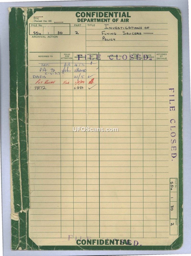 This file documents the RAAF's administrative policy and investigative procedures for UFO reports from 1953 to 1972. It demonstrates the RAAF's reliance on US findings to conclude that UFOs were not a security threat and did not warrant extensive scientific research.