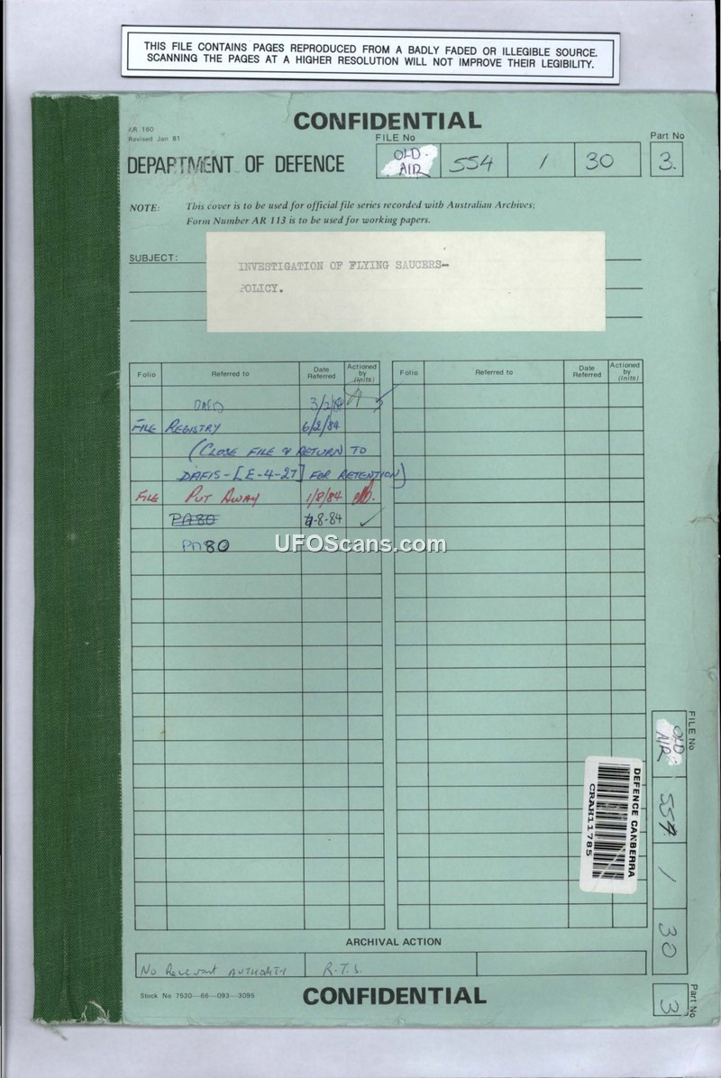 This file contains correspondence and policy documents from the Australian Department of Defence regarding the investigation of Unidentified Aerial Sightings (UAS), formerly referred to as UFOs. The documents span from 1972 to 1981 and detail the RAAF's evolving policy on handling public reports. The RAAF maintained a responsibility to investigate these sightings to ensure national security, but consistently concluded that no threat existed. By 1981, senior officers, including Squadron Leader I.S. Frame and Group Captain G.A. Perske, argued that the administrative burden of investigating these reports was difficult to justify in the current economic climate. They noted that investigations required significant time from specialist branches like Meteorology and Air Traffic Control, which were already undermanned. The RAAF frequently cited the USAF 'Condon Report' (1968) to validate their stance that UFO studies did not contribute to scientific knowledge. The file includes various internal memoranda, lecture texts for public dissemination, and summaries of sightings from 1974 to 1977, which were often attributed to satellites, space debris, aircraft, or celestial bodies like Venus. The RAAF's approach was to provide a 'service' to the public while minimizing the resources dedicated to these investigations, often by referring enquirers to civilian organizations or providing standard explanations for common phenomena.