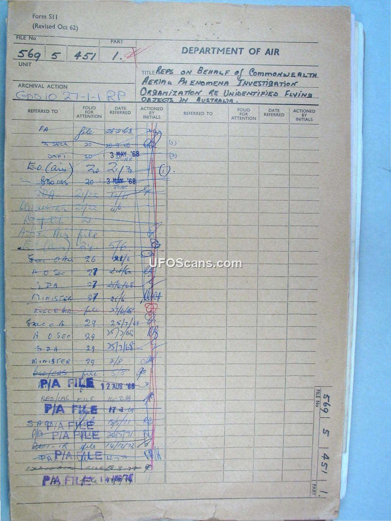 This document is a collection of correspondence and internal government minutes from the Australian Department of Air, spanning 1966 to 1968. The file centers on requests made by the Commonwealth Aerial Phenomena Investigation Organization (C.A.P.I.O.), represented by its President, Mr. P.E. Norris, and supported by Member of Parliament Philip W. Stokes, for the Australian government to provide financial assistance for UFO research. The proponents of this funding argued that UFOs were an international problem and pointed to the United States government's grant of $500,000 to the University of Colorado for the 'Colorado Project' as a precedent for serious scientific investigation. The Department of Air, through various ministers including Gordon Freeth and Peter Howson, consistently rejected these requests. The government's position was that the Royal Australian Air Force (RAAF) was responsible for investigating sightings only insofar as they posed a potential threat to national security. The Department argued that it was not equipped or mandated to conduct scientific research into the nature of these phenomena. Internal minutes reveal that the Department of Air was concerned about the administrative burden of answering public inquiries and sought to minimize its involvement, even considering whether another department might be better suited to handle the subject. The file also includes technical summaries of sightings reported to the Department of Air, which were often attributed to astronomical phenomena, aircraft, or weather balloons. The government maintained that there was no evidence of extra-terrestrial vehicles and that the existing RAAF procedures were sufficient for national defense needs.