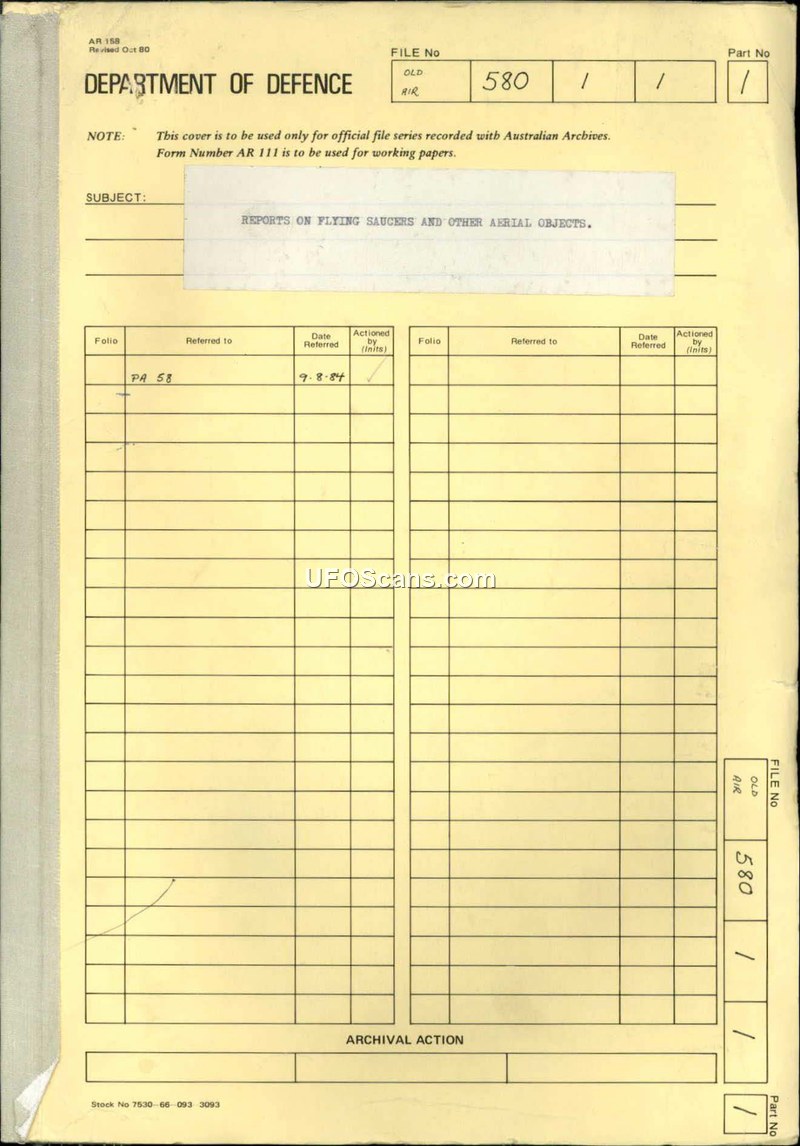 Department of Air File 580/1/1: Reports on Flying Saucers and Other Aerial Objects