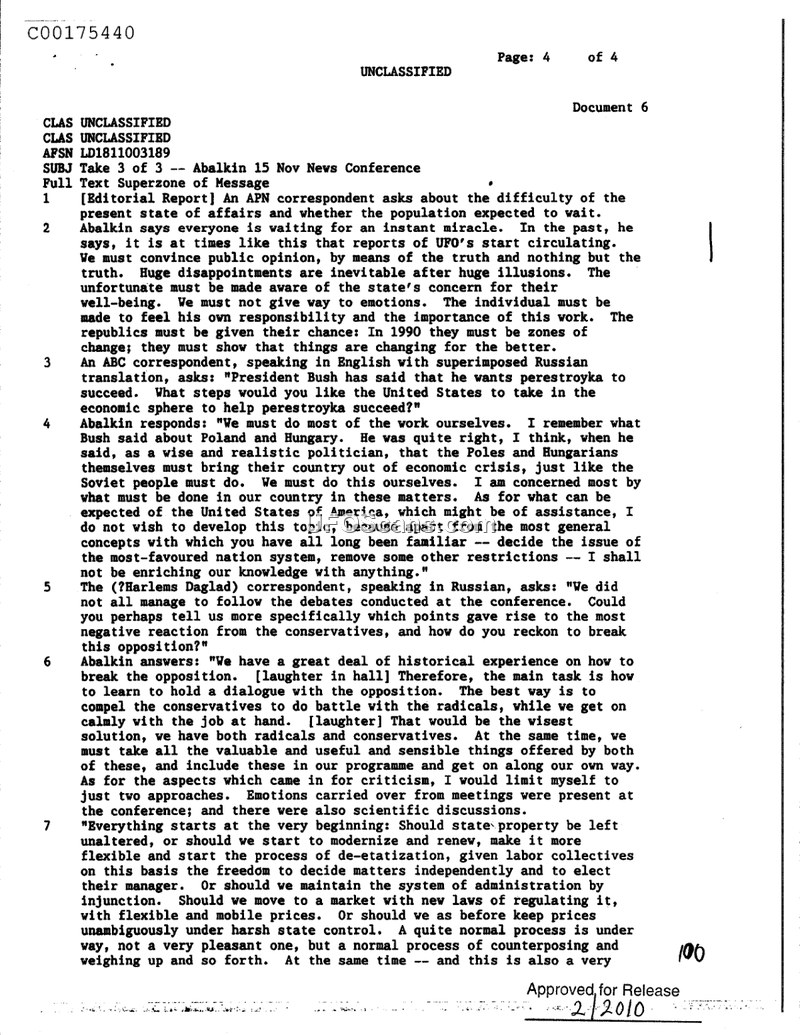 The document is a transcript of a news conference held by Abalkin on November 15, 1989. Abalkin discusses the need for internal reform in the Soviet Union, the importance of truth in public discourse, and the necessity of managing political opposition through dialogue and pragmatic policy-making. He emphasizes that the Soviet people must solve their own economic crises rather than relying on external miracles.