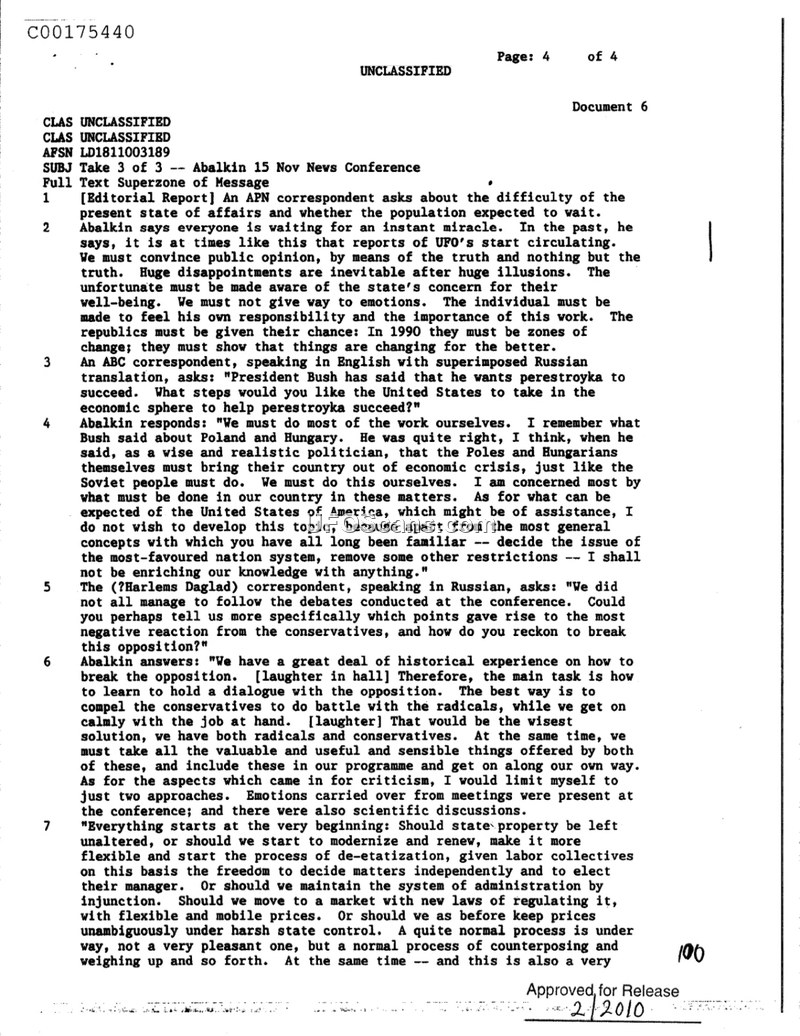 A transcript of a November 1989 news conference where Abalkin discusses Soviet economic reforms and political opposition. He briefly mentions the circulation of UFO reports as a symptom of public disillusionment during times of crisis.