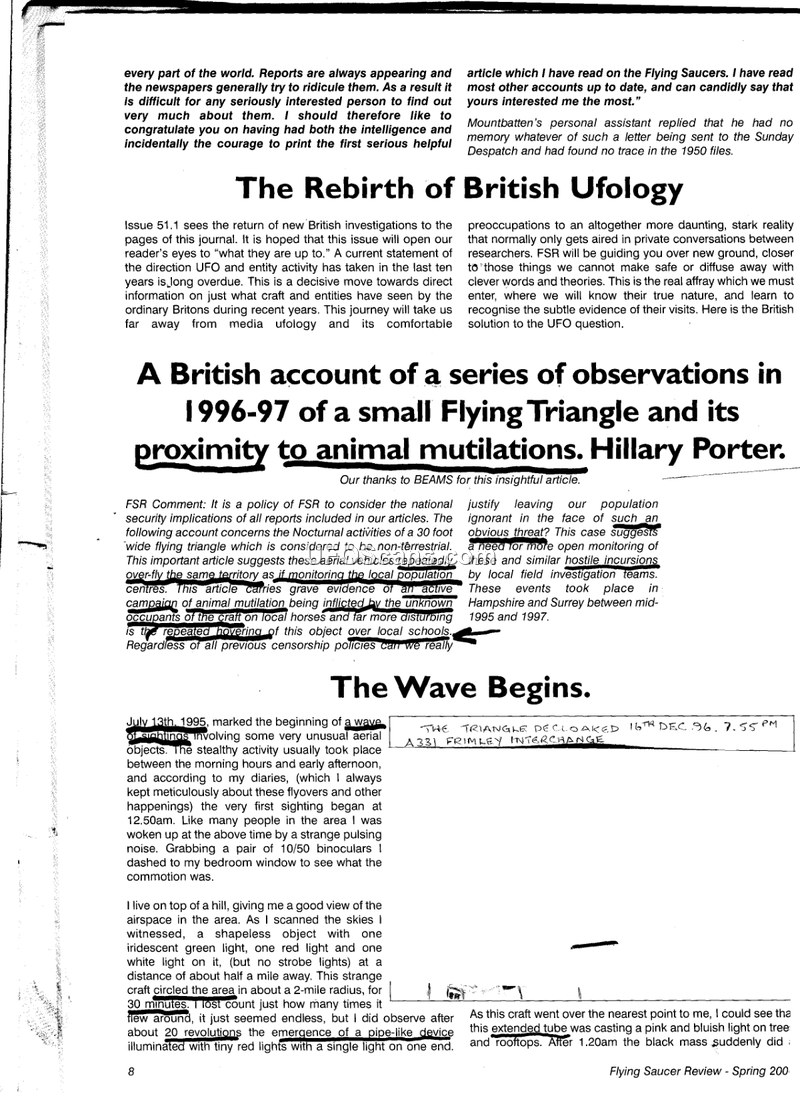 This article, published in the Flying Saucer Review, details a series of observations and investigations conducted by Hillary Porter regarding a small flying triangle and its alleged connection to animal mutilations in the United Kingdom, specifically within Hampshire, Surrey, and Shropshire. Porter describes a wave of sightings beginning in July 1995, characterized by a stealthy, 30-foot triangular craft that emitted beams of light and was often accompanied by strange pulsing noises. The author reports that these sightings frequently coincided with incidents of animal mutilation, particularly involving horses and sheep. Porter provides detailed accounts from witnesses, including a farmer named Max and an abductee named Tom, who claim to have had direct contact with non-human entities. These entities are described as having 'grey' features or being 'guardians' who monitor human evolution. The document highlights the physical evidence found at sites, such as triangular ground traces and soil samples, as well as the physiological and psychological impact on witnesses. Porter argues that these events are not isolated but part of a broader, ongoing phenomenon involving advanced, non-terrestrial technology and a systematic, clandestine agenda. The author emphasizes the lack of official acknowledgement and the fear experienced by local populations, suggesting that the authorities are either ignorant of or complicit in the censorship of these events.