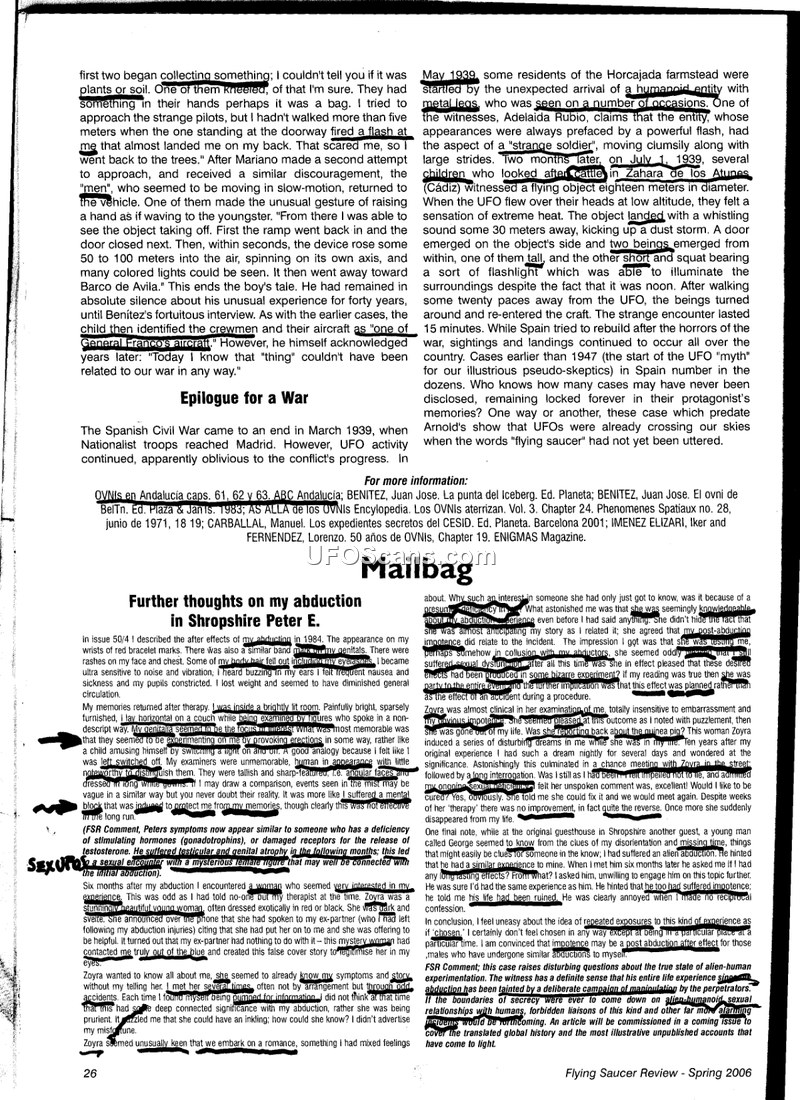 This document, an excerpt from the Spring 2006 issue of Flying Saucer Review, presents two distinct accounts of anomalous phenomena in Spain and the United Kingdom. The first section details historical sightings in Spain during and shortly after the Spanish Civil War. In May 1939, residents of the Horcajada farmstead reported an encounter with a humanoid entity wearing metallic clothing. Shortly thereafter, on July 1, 1939, children in Zahara de los Atunes, Cádiz, observed a craft that landed with a whistling sound, kicking up dust. Two entities emerged—one tall and one short—before the craft departed. The text notes that these events occurred before the term 'flying saucer' was popularized. The second section features a personal account from an individual identified as Peter E., who describes an ongoing abduction experience. Peter E. reports physical symptoms, including rashes and genital atrophy, following an encounter with an entity he refers to as Zoyra. He describes Zoyra as a stunningly beautiful woman who appeared in his home. Peter E. claims that his therapist was aware of the situation and that he later encountered another individual who shared similar experiences. The document concludes with a reflection on the psychological and physical impact of these alleged abductions, suggesting that such events are part of a larger, deliberate campaign of manipulation.
