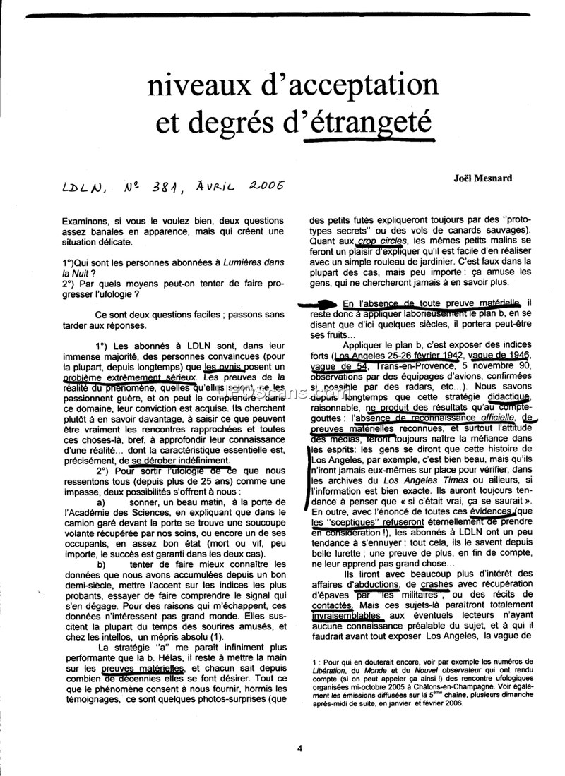 This article, written by Joël Mesnard for the April 2006 issue of LDLN (N° 381), explores the methodological challenges facing ufology. Mesnard poses two fundamental questions: who are the subscribers to the publication 'Lumières dans la Nuit' (LDLN), and how can one advance the study of ufology? He argues that the majority of subscribers are already convinced of the reality of the phenomenon. He critiques the 'Plan B' approach—attempting to convince the public through hard evidence—noting that even well-documented cases like the 1954 Trans-en-Provence incident or the 1946 Los Angeles sightings fail to satisfy skeptics or the media. Mesnard suggests that the field is trapped in a cycle where the lack of absolute proof leads to constant doubt. He discusses the 'levels of acceptance' and 'degrees of strangeness,' proposing that an observer's threshold for belief is tied to their personal tolerance for the 'incredible.' He references historical cases, such as the Betty and Barney Hill abduction, to illustrate how initially rejected ideas can eventually gain acceptance. The article concludes by advocating for a balanced approach that maintains scientific rigor and discernment, acknowledging that while absolute proof is elusive, the accumulation of data remains necessary for serious inquiry.