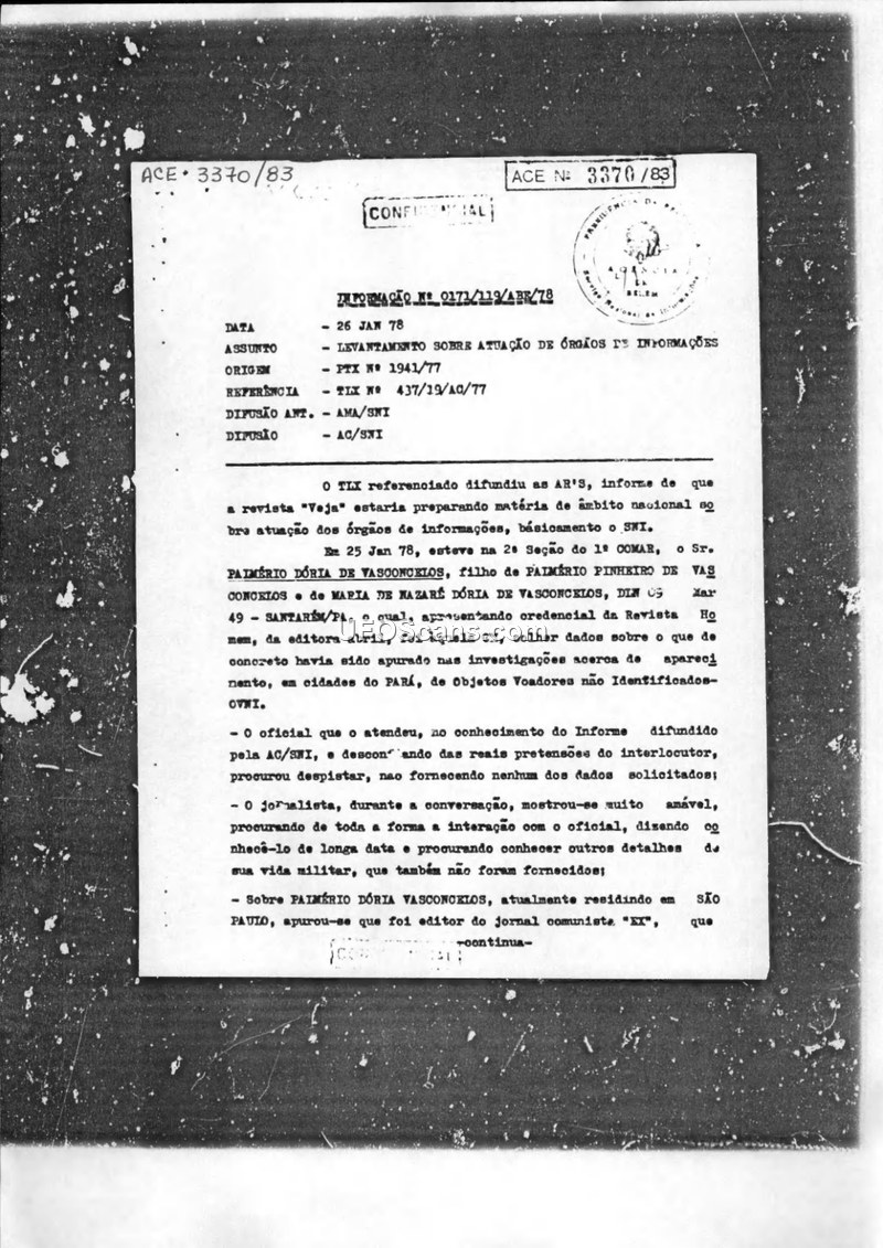 This document is a comprehensive mission report regarding 'Operação Prato,' an investigation conducted by the 1st Regional Air Command (1° COMAR) of the Brazilian Air Force into Unidentified Aerial Phenomena (UAP) in the state of Pará, Brazil, between April and November 1977. The report details the deployment of an intelligence team to the city of Colares and surrounding areas following persistent reports from the local population regarding strange objects in the sky. These objects were frequently described as metallic, cylindrical, or conical, capable of high-speed maneuvers, and emitting intense light beams. Witnesses, including local residents and a physician, Dr. Wellaide Cecim de Carvalho, reported physiological effects after being struck by these light beams, such as paresis, burns, nausea, and small puncture marks on the skin. The report includes detailed accounts from various witnesses, including a local priest and several residents, who described the objects' behavior, including their silent flight and the emission of colored lights. The military team attempted to document these phenomena using cameras and theodolites, resulting in several photographs and observations of light patterns. However, the report notes a lack of consensus among the team members regarding the nature of the phenomena, largely due to the fear of professional ridicule. The document also highlights the role of the local press in amplifying the reports, which the military authorities viewed as a factor contributing to public panic and skepticism. The mission report concludes with a summary of observations and the ongoing efforts of the 1st Air Command to continue investigations, despite the challenges posed by the sensationalist nature of the media coverage and the difficulty in obtaining concrete, scientific data.