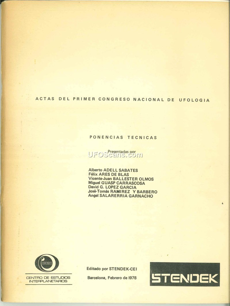 This document contains the proceedings of the First National Congress of Ufology held in Barcelona on December 3-4, 1977. Published by STENDEK-CEI in February 1978, the volume serves as a foundational text for the scientific study of Unidentified Aerial Phenomena (UAP/OVNI) in Spain. The authors, including prominent researchers like Vicente-Juan Ballester Olmos, Miguel Guasp Carrascosa, and David G. Lopez, advocate for moving ufology from a 'pre-scientific' stage to a rigorous, empirical discipline. The text is divided into three main parts: the establishment of a theoretical model, the analysis of collateral factors, and a detailed statistical study of 28 years of observations in Spain. The authors argue that UAP sightings are not random but follow patterns that can be analyzed through statistical methods such as Poisson distributions, regression analysis, and clustering techniques. They emphasize the importance of controlling for variables like population density, geography, meteorology, and the influence of media coverage on sighting reports. A significant portion of the document is dedicated to the case of Javier Bosque, a seminarist who reported an ovoid object in Logroño in 1972. This case is analyzed using technical data, including tape recordings and oscilloscope readings, to demonstrate the potential for scientific investigation of physical evidence. The authors maintain a skeptical stance toward 'magical' or purely extraterrestrial explanations, preferring to treat UAP as a physical phenomenon that requires systematic, data-driven study. They conclude that while the phenomenon remains largely unexplained, the application of scientific methodology—including the use of computers for data analysis—is the only viable path forward for ufology to gain academic legitimacy.