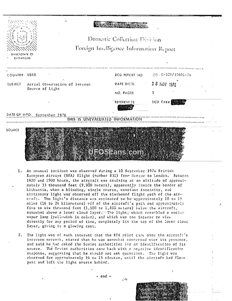 This Foreign Intelligence Information Report, issued by the Domestic Collection Division on 18 November 1976, details an unusual aerial observation reported by a British European Airways (BEA) flight. On 10 September 1976, between 1800 and 1900 hours, BEA flight 831 was traveling from Moscow to London at an altitude of approximately 33,000 feet. While over the border of Lithuania, the flight crew observed a stationary, blinding, single source of light off the starboard side of the aircraft. The light was estimated to be 10 to 15 miles away and positioned 5,000 to 6,000 feet below the aircraft, hovering above a lower cloud layer. The object was described as having a yellowish color, resembling a sodium vapor lamp, and was of such high intensity that it was impossible to view directly. The light was bright enough to illuminate the top of the cloud layer below it, creating a glowing effect. The pilot, concerned by the presence of the light, contacted Soviet authorities via the aircraft's intercom network to request an identification of the source. The Soviet response was a negative identification, accompanied by a suggestion that the pilot should refrain from asking further questions. The light remained visible to the crew for approximately 10 to 15 minutes until the aircraft moved past the object.