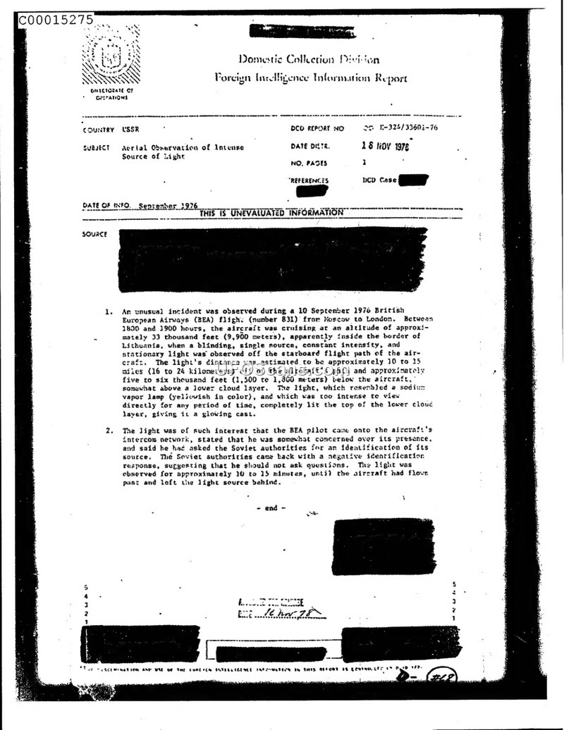 On 10 September 1976, a British European Airways (BEA) flight, identified as number 831, was traveling from Moscow to London. Between 1800 and 1900 hours, while the aircraft was cruising at approximately 33,000 feet (9,900 meters) near the border of Lithuania, the crew observed an unusual light. The object was described as a blinding, single source of constant intensity that remained stationary off the starboard side of the aircraft. The pilot estimated the light to be 10 to 15 miles (16 to 24 kilometers) away and positioned 5,000 to 6,000 feet (1,500 to 1,800 meters) below the aircraft, hovering above a lower cloud layer. The light, which was yellowish in color and resembled a sodium vapor lamp, was so intense that it could not be viewed directly and cast a glow upon the clouds below. The pilot contacted Soviet authorities to request an identification of the source. The Soviet response was negative, and the pilot was advised not to ask further questions. The light remained visible for 10 to 15 minutes until the aircraft moved past it.