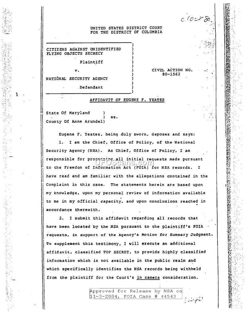 This document is an affidavit signed by Eugene F. Yeates, Chief of the Office of Policy at the National Security Agency (NSA), on September 30, 1980. It was submitted to the United States District Court for the District of Columbia in the case of Citizens Against Unidentified Flying Objects Secrecy v. National Security Agency (Civil Action No. 80-1562). The affidavit serves to justify the NSA's decision to withhold records requested by the plaintiff under the Freedom of Information Act (FOIA). Yeates explains that the NSA received four separate referrals from the Central Intelligence Agency (CIA) regarding documents related to UFOs and UFO phenomena. The NSA determined that these records were exempt from release under various FOIA exemptions, primarily 5 U.S.C. 552(b)(1) (classified information) and 5 U.S.C. 552(b)(3) (information protected by statute, including 18 U.S.C. 798, 50 U.S.C. 403(d)(3), and Public Law 86-36). The affidavit details the NSA's mission as a signals intelligence (SIGINT) agency, specifically focusing on communications intelligence (COMINT). Yeates argues that the records in question are products of these COMINT activities. He asserts that releasing the records would identify the specific communications lines, channels, and systems targeted by the NSA, as well as the agency's processing techniques. Such disclosure, he contends, would allow foreign governments to take countermeasures, thereby defeating the NSA's intelligence-gathering capabilities and causing grave damage to national security. The document also addresses four non-COMINT records, noting that some were released with deletions to protect employee names or sensitive operational information, while others were found to be non-responsive to the plaintiff's request. Yeates concludes by stating that he has personally reviewed the withheld records and determined that they remain properly classified under Executive Order 12065.