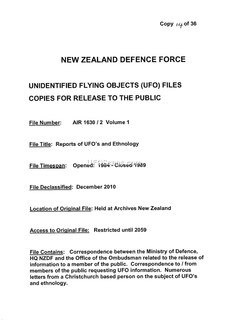 New Zealand Defence Force Unidentified Flying Objects (UFO) Files: AIR 1630 / 2 Volume 1
