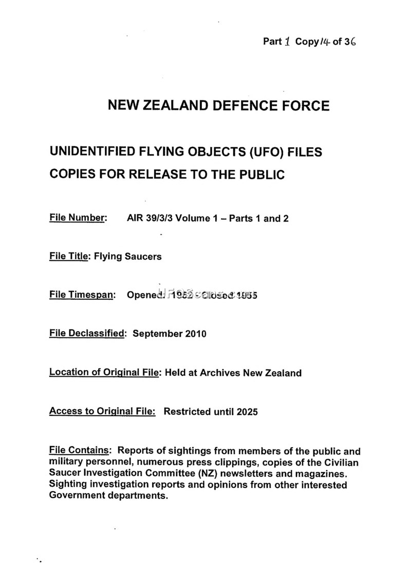 New Zealand Defence Force Unidentified Flying Objects (UFO) Files: Copies for Release to the Public