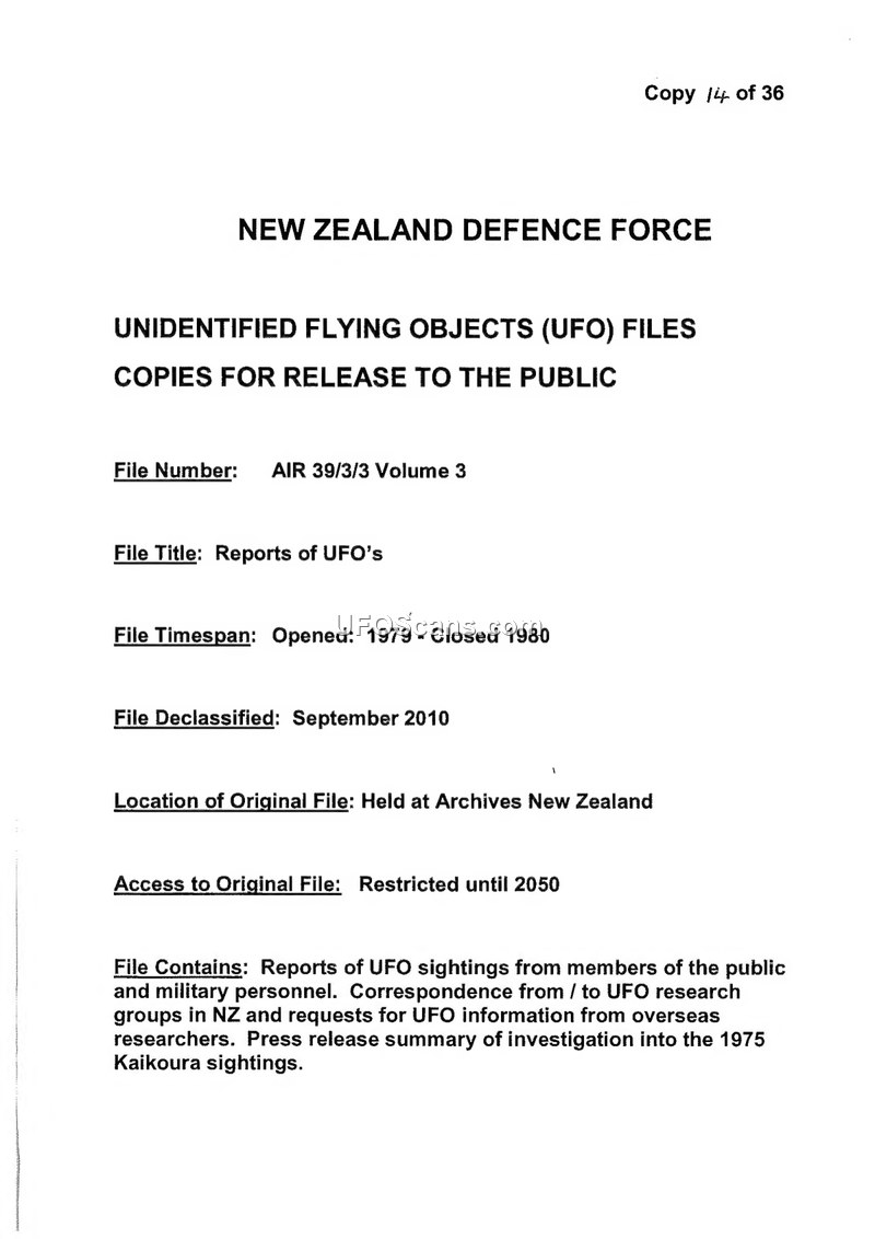 New Zealand Defence Force Unidentified Flying Objects (UFO) Files: AIR 39/3/3 Volume 3