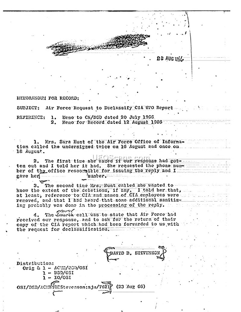 This Memorandum for Record, dated August 23, 1966, and authored by David B. Stevenson, documents administrative communications between the CIA's Office of Scientific Intelligence (OSI) and the Air Force Office of Information regarding the declassification of a CIA UFO report. Mrs. Sara Hunt of the Air Force contacted Stevenson three times between August 16 and August 18, 1966. During these interactions, she inquired about the status of the CIA's response and the extent of any deletions made to the document. Stevenson informed her that references to the CIA and the names of CIA employees had been removed, and noted that further sanitization had likely been performed during the processing of the reply. The final communication from the Air Force confirmed receipt of the response and included a request for the return of the Air Force's copy of the CIA report that had been submitted for declassification review.