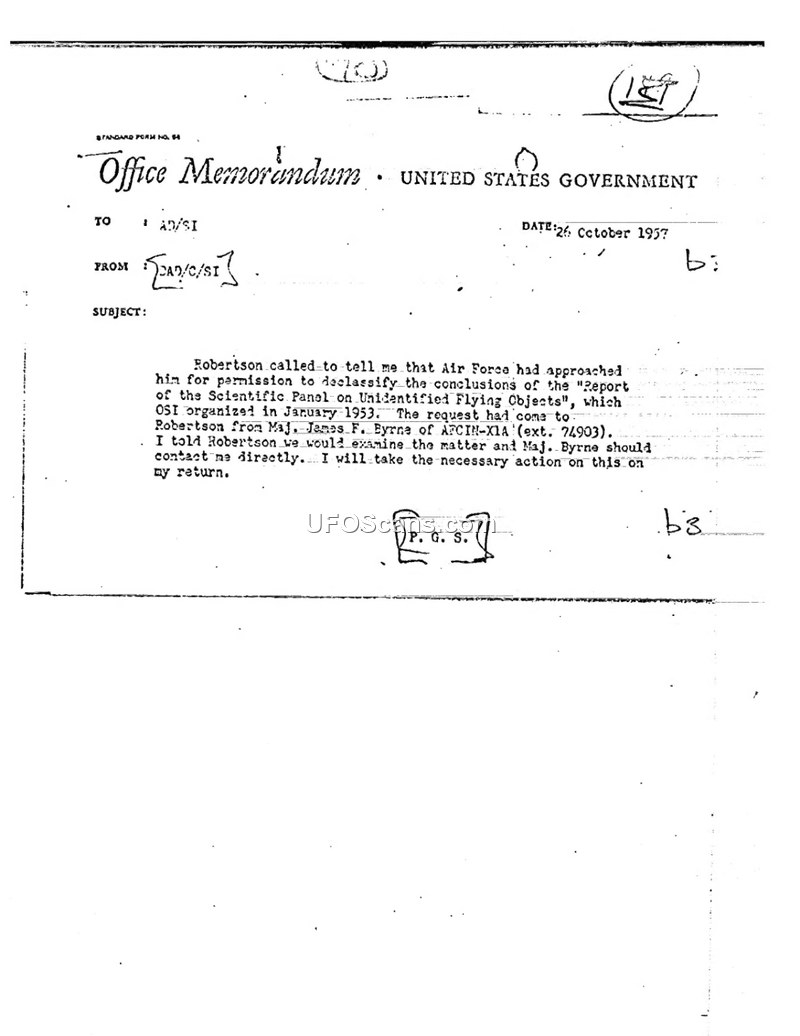 Robertson called to tell me that Air Force had approached him for permission to declassify the conclusions of the "Report of the Scientific Panel on Unidentified Flying Objects", which OSI organized in January 1953.