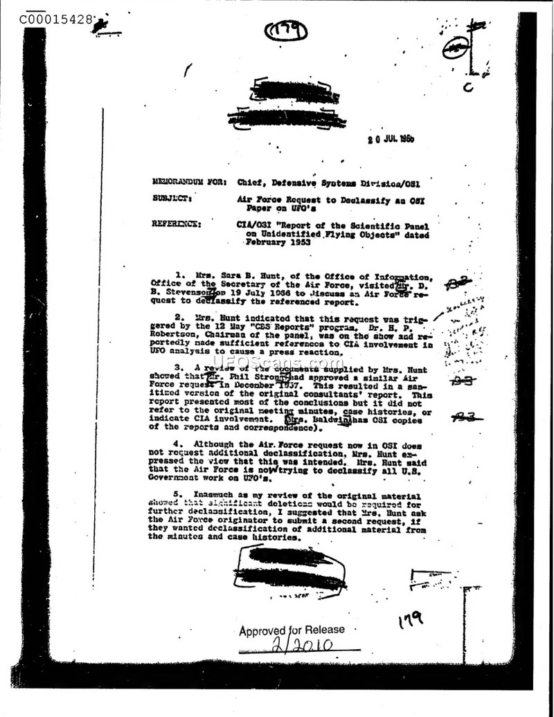 This memorandum, dated 20 July 1966, documents a meeting between Mrs. Sara B. Hunt of the Office of the Secretary of the Air Force and D. B. Stevenson regarding an Air Force request to declassify the CIA/OSI 'Report of the Scientific Panel on Unidentified Flying Objects' from February 1953. Mrs. Hunt indicated that the request was prompted by a CBS Reports program aired on 12 May 1966, during which Dr. H. P. Robertson, the panel chairman, made references to CIA involvement in UFO analysis, triggering public reaction. A review of previous documentation revealed that Mr. Phil Strong had approved a similar request in December 1957, which resulted in a sanitized version of the report that omitted meeting minutes, case histories, and references to CIA involvement. Although the current Air Force request did not explicitly ask for additional declassification, Mrs. Hunt suggested that the Air Force intends to declassify all U.S. Government work on UFOs. The author advised Mrs. Hunt that further declassification would require significant deletions and recommended that the Air Force submit a formal second request for the specific minutes and case histories. The document concludes by noting that Mr. Loomis is holding the current request pending further contact from Mrs. Hunt.