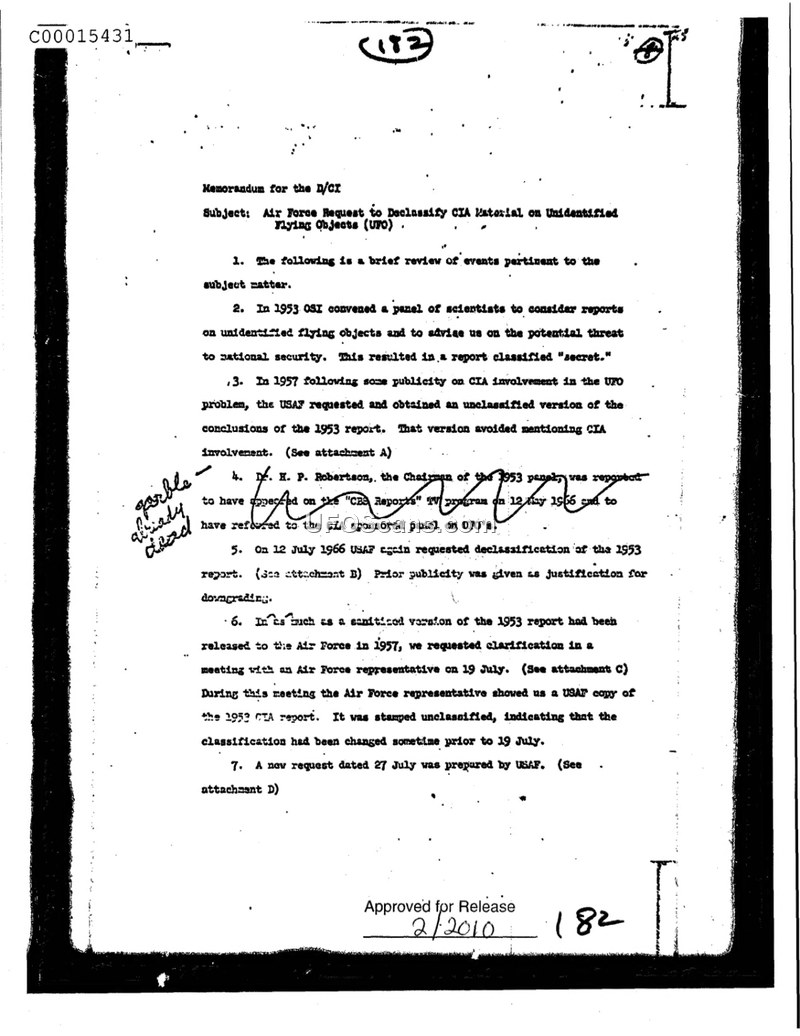 This memorandum, dated September 1, 1966, provides a chronological review of the interactions between the CIA and the Air Force regarding the declassification of a 1953 report on Unidentified Flying Objects. In 1953, the CIA's Office of Scientific Intelligence (OSI) convened a panel of scientists to assess the threat posed by UFOs, resulting in a classified report. In 1957, following public interest, the Air Force requested and received an unclassified version of the report's conclusions, which omitted references to CIA involvement. By July 1966, the Air Force again requested declassification of the 1953 report, citing prior publicity as justification. During a meeting on July 19, 1966, the Air Force presented a copy of the 1953 report that had already been stamped 'unclassified.' Subsequent requests were made by the Air Force, including an inquiry on August 10, 1966, regarding the status of the CIA's reply, prompted by an article written by newsman John Lear in the Saturday Review. This article indicated that the Air Force desired the release of the complete CIA report to the public. On August 15, 1966, the CIA forwarded a declassified version of the complete 1953 report to the Air Force. The document concludes by noting that the Air Force made follow-up inquiries on August 16 and August 18, 1966, regarding the extent of the sanitization and the return of the USAF copy of the report.