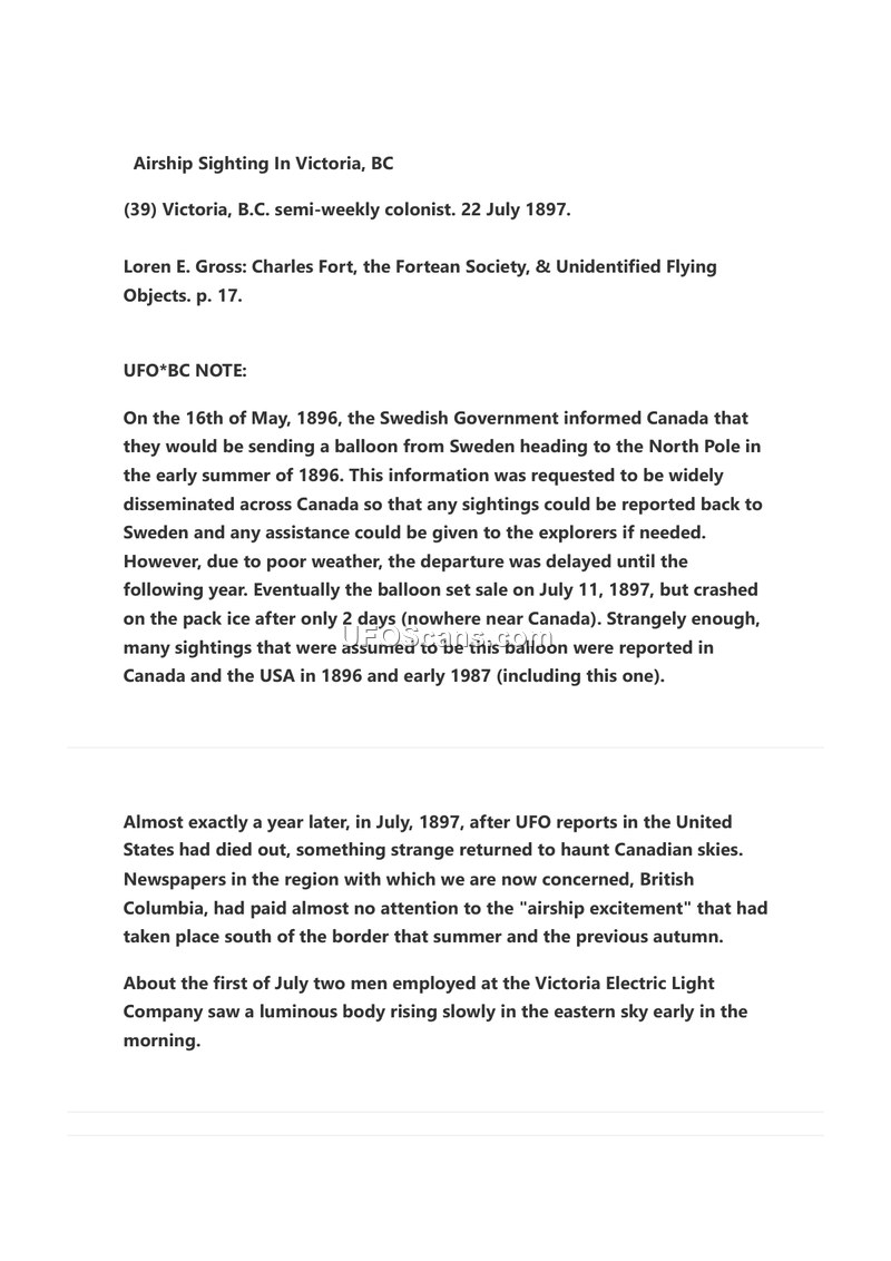 This document records a July 1897 sighting of a luminous object in Victoria, BC, by two utility company employees. It also clarifies that many contemporary sightings were misattributed to a failed Swedish balloon expedition.