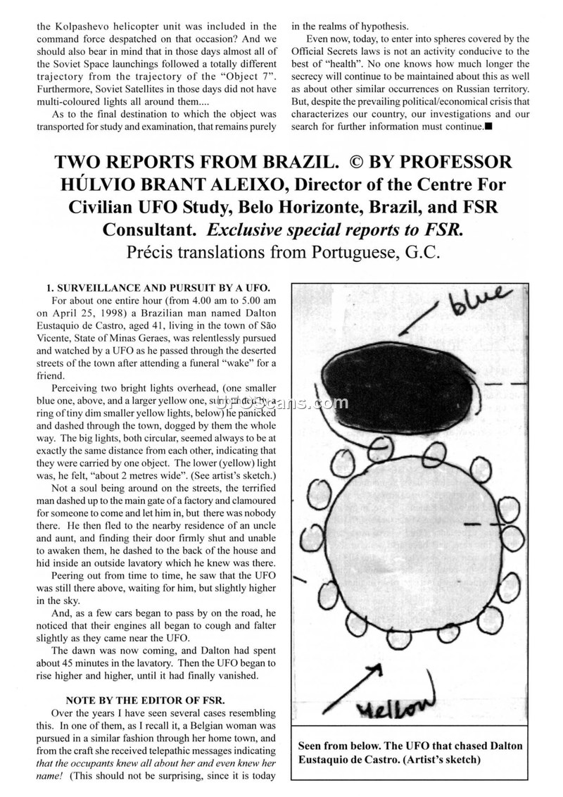 This document contains two reports from Brazil compiled by Professor Húlvio Brant Aleixo for the Flying Saucer Review (FSR). The first report details a sighting on April 25, 1998, in São Vicente, Minas Gerais, where a man named Dalton Eustaquio de Castro was pursued for one hour by a UFO. The object was described as having a blue light on top, a larger yellow light below, and a ring of smaller yellow lights. The witness reported that the object was approximately two metres wide and that passing car engines faltered as the object approached. The second report concerns an 'anomalous biological entity' at the Rancho Alegre plantation in Mateus Leme, Minas Gerais, in September 1997. The caretaker, José Rodrigues Corrêa, reported missing birds and dead chickens with small holes in their throats. Corrêa later encountered a dark-coloured creature in a ditch, which he described as having a flat head, large eyes with yellow spots, and a powerful odour of crushed garlic and sulphur. The document also includes a separate report by Mauren Andrea Stieven regarding a 'chupacabra' epidemic in South-Central Brazil during 1997, noting various livestock mutilations in the regions of Mato Grosso do Sul and Paraná.