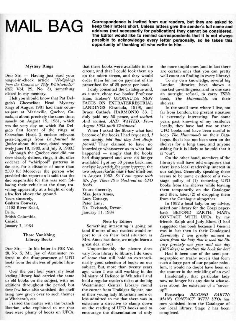 This document consists of two letters to the editor published in the Flying Saucer Review (FSR). The first letter, from Graham Conway of British Columbia, Canada, dated January 7, 1984, discusses the appearance of 'mystery rings' in oats at Marieville, Quebec, on August 19, 1981. Conway notes that these rings exhibited 'whirlpool' patterns and were observed by an individual who claimed the responsible object was hovering a few feet above the ground. The second letter, from Mrs. Joan Amos of Tavistock, Devon, dated January 11, 1984, addresses a previous letter by a Mr. Jay regarding the disappearance of UFO-related books from public libraries. Mrs. Amos recounts her own difficulties in obtaining specific UFO titles from her local library, noting that books she requested would disappear from the catalogue or be marked as unavailable. She describes a personal experience where she was told by a librarian that there was a directive to discourage the dissemination of UFO literature. Mrs. Amos concludes that there is a 'black-out' on UFO books in libraries. The editor adds a note confirming that readers' reports on local library situations are valuable for understanding this trend.