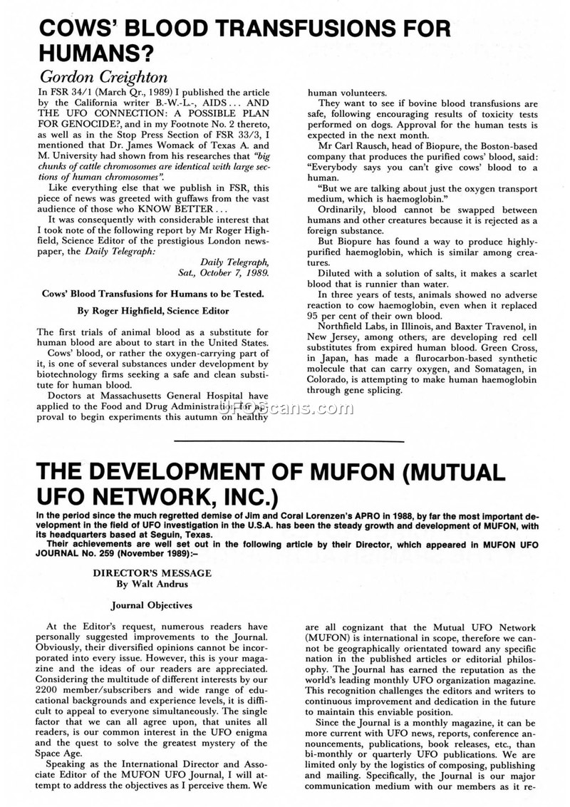 This document consists of excerpts from the Flying Saucer Review (FSR), specifically referencing the November 1989 issue. The text covers three distinct topics. First, it discusses medical research regarding bovine blood transfusions and the potential for synthetic hemoglobin, noting that such research is unrelated to UFOs but was mentioned in previous FSR issues. Second, it provides an overview of the Mutual UFO Network (MUFON) following the dissolution of APRO in 1988. Walt Andrus, the International Director, outlines the objectives of the MUFON UFO Journal, emphasizing its role as a professional publication for the international ufology community. The text also highlights the editorial standards of the journal and mentions the book 'The Gulf Breeze Sightings' by Edward and Francis Walters. Finally, the document includes a report by J. Plana Crivillén regarding the Spanish Air Ministry's official 'Notes' on UFOs. This section details two specific incidents from 1968, including a report of a UFO following a SPANTAX aircraft near the Canary Islands on March 14, 1968, and a sighting over Madrid on September 6, 1968. The document serves as a historical record of the state of ufological discourse and organizational development in the late 1980s.
