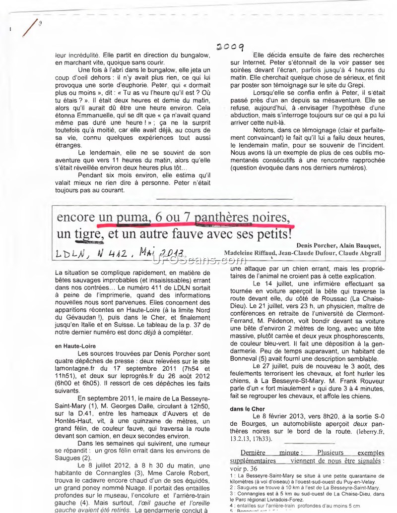 This document, an issue of the periodical LDLN (May 2013), serves as a compilation of reports regarding anomalous events, specifically focusing on sightings of large felines and unidentified aerial phenomena. The text details several incidents in France, including sightings in Haute-Loire and Cher, where witnesses reported large cats crossing roads or attacking livestock. One specific case involves a witness named Carole Robert, who discovered the fresh corpse of an equine with deep wounds. The document also discusses international reports, such as a 1990 sighting in Italy involving Horace Negri, who observed a large, silent craft. Additionally, the text mentions the upcoming publication of the second volume of Jacques Vallee's memoirs and references various other researchers and contributors like Jean-Claude Dufour and Jean Sider. The document emphasizes the difficulty of verifying these reports and the tendency for witnesses to be skeptical or hesitant to share their experiences. It also touches upon the confusion surrounding reports of 'black panthers' and other large cats in various regions, noting that many such animals are never recovered.