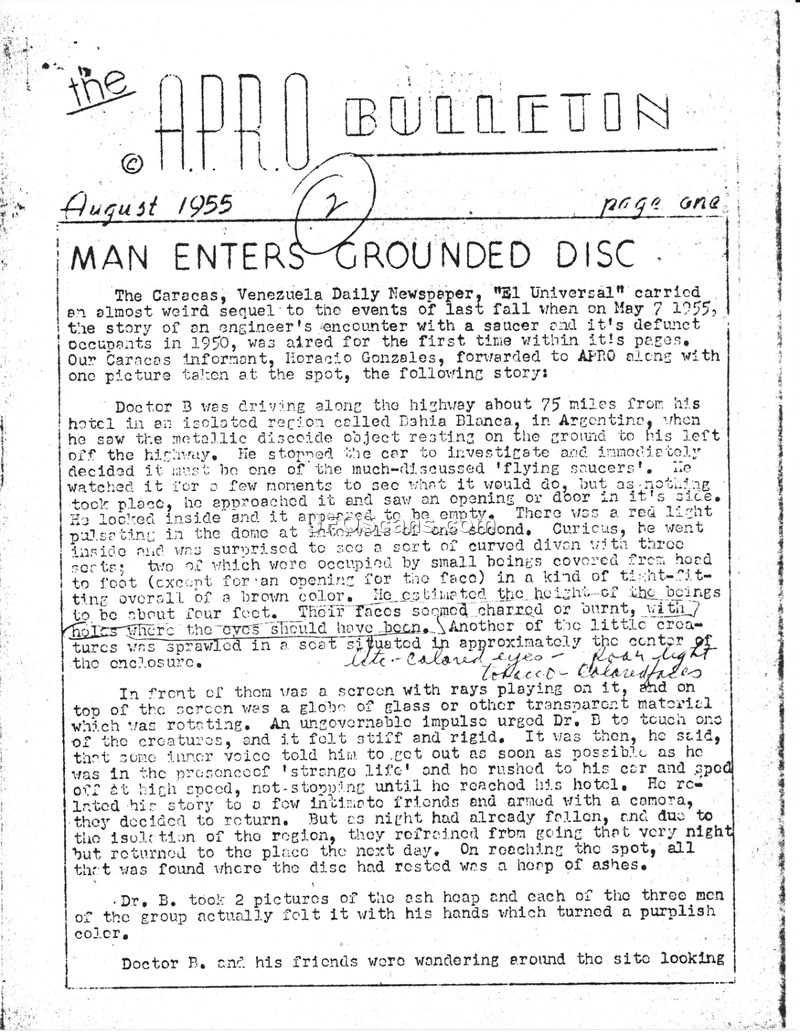 The August 1955 issue of the APRO Bulletin serves as a compilation of reports regarding Unidentified Aerial Phenomena (UFOs) from various global locations. The lead story details an account from 1950 in Bahia Blanca, Argentina, where an aeronautical engineer, referred to as 'Dr. B.', allegedly encountered a grounded metallic disc. Dr. B. reported entering the craft, which he described as empty, containing a curved divan and small, charred-looking beings. Following this encounter, he reported suffering from fever and skin blisters. The bulletin also includes numerous other sighting reports from 1955, including incidents in New York City, Nebraska, Illinois, Maine, California, Peru, England, and Venezuela. These reports describe various phenomena, such as cigar-shaped objects, glowing fireballs, and disc-shaped craft. The bulletin highlights the skepticism of the Air Force regarding these sightings, often attributing them to weather balloons, meteors, or guided missiles. A significant portion of the text is dedicated to the 'odds 'n' ends' section, which discusses public and media reactions to UFO reports, including the influence of science fiction media and the perceived silence of the press. The publication also notes the activities of the Aerial Phenomena Research Organization (APRO), including their efforts to document and analyze these sightings, and mentions the involvement of members in reporting and investigating local incidents. The bulletin maintains a critical stance toward official explanations, suggesting that the military and government agencies are often dismissive of evidence that does not fit conventional explanations.